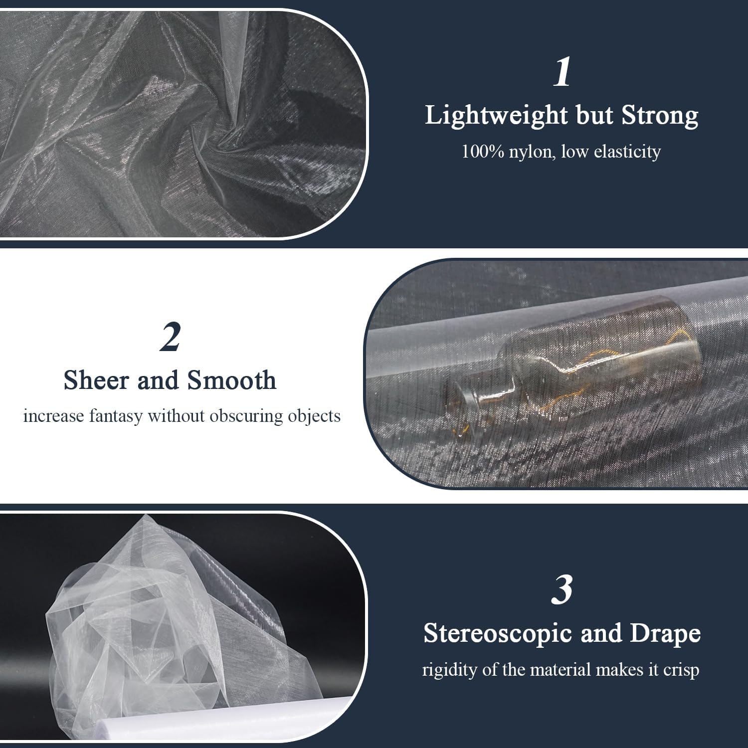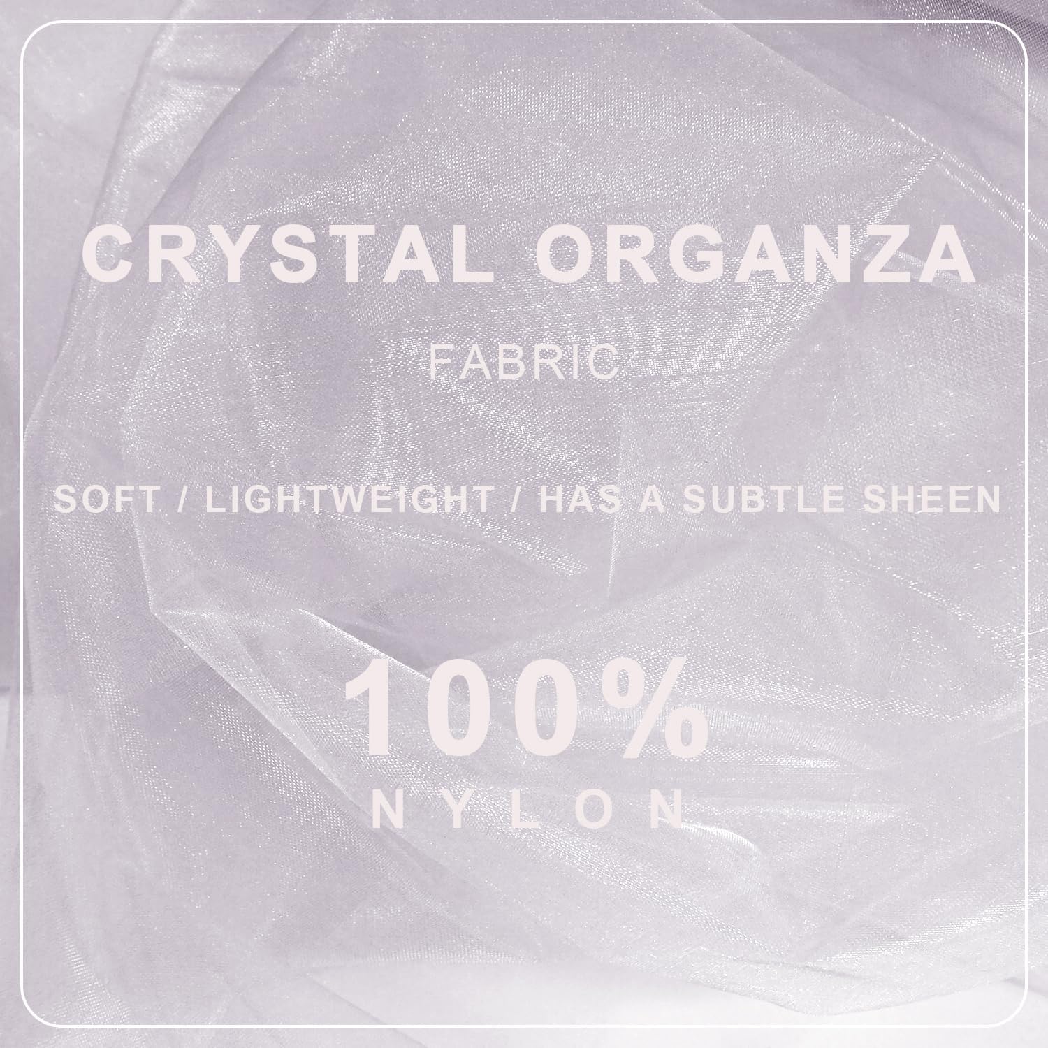 - Lightweight but Strong: Crystal organza is made of nylon with low elasticity. Thin, translucent, smooth, soft, fine texture. The rigidity of the material makes it crisp, bringing stereoscopic and drape. Sheer fabric creates a full silhouette that looks great both in reality and in photos.