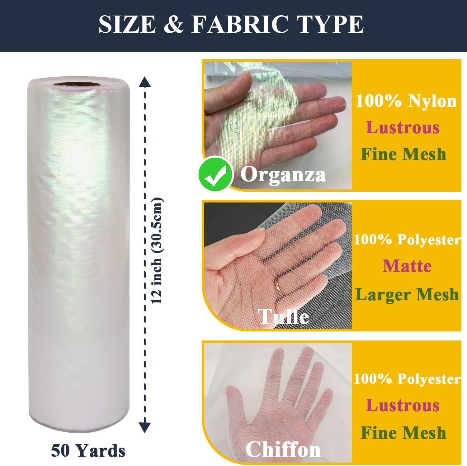 - Lustrous Tulle Fabric: 12 Inches wide, 50 yards long. Plain weave method makes organza fabrics have finer meshes than chiffon and tulle, making them highly breathable. More yarn reflects light better, so there's more sparkle to it.