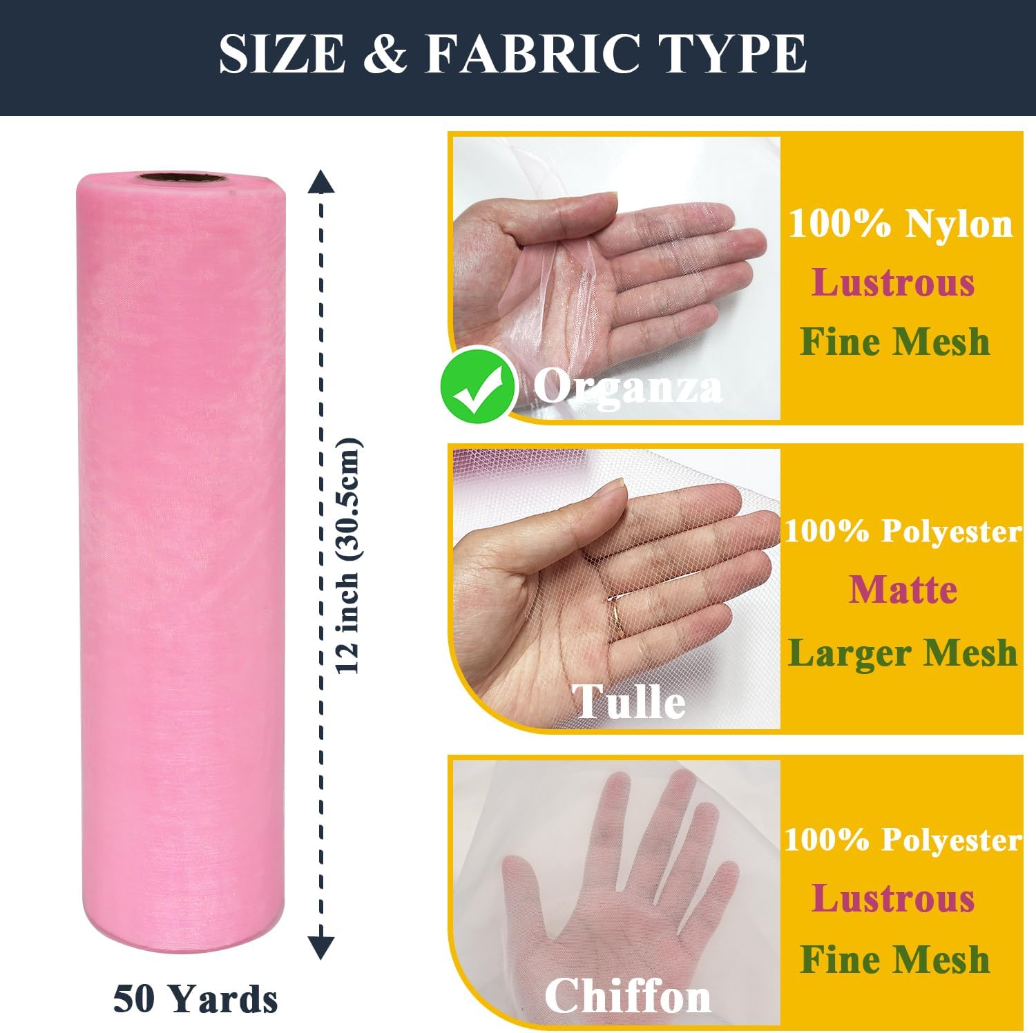 Pink Organza Tulle Fabric Rolls, Crystal Organza 12" by 50 Yards (150 ft) Sheer Nylon Silky Shiny Netting Spool Bolt for DIY Craft Table Runner Wedding Baby Shower Party Decor (Light Pink)