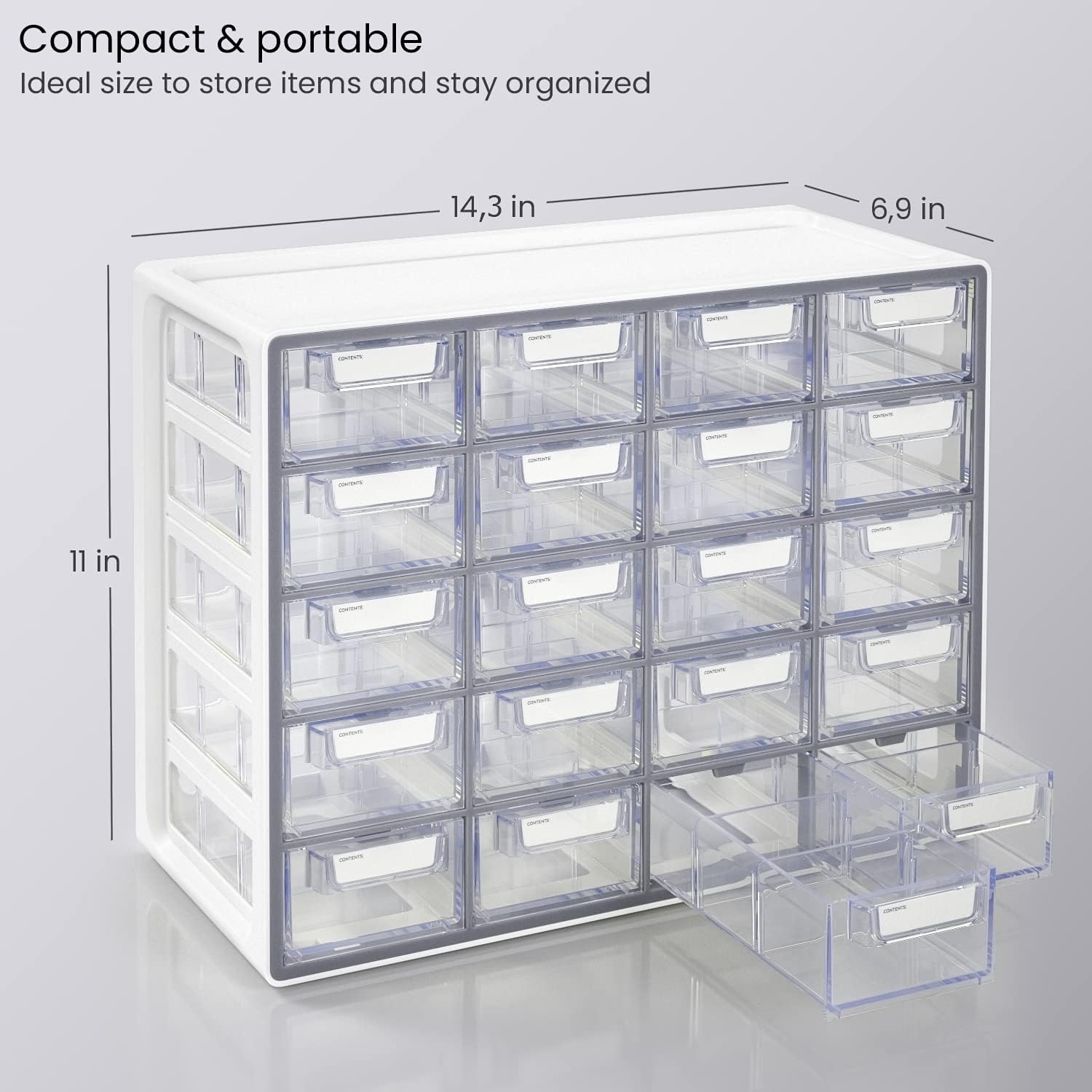 - Multipurpose 20 Drawer Storage Cabinet – Compact organizer cabinet (14.3" x 11" x 6,9") with clear drawers keeps small supplies tidy and visible on your desk, vanity, craft table, classroom shelf, or workbench. Perfect for organizing pens, sewing notions, beads, beauty products, and more.