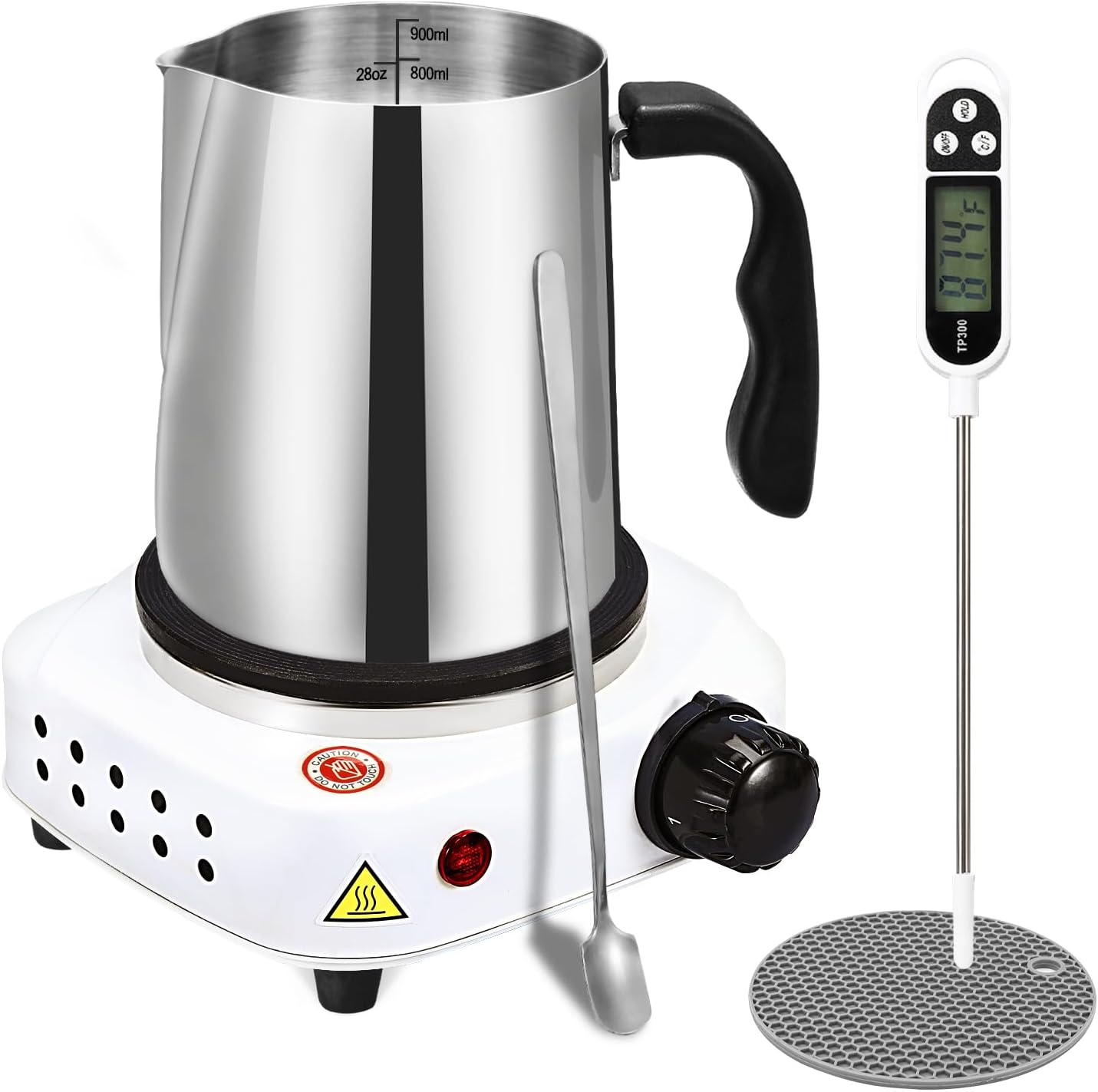 - 【Candle Making Supplies】Candle Making Starter Kit Includes 1x900ml Candle Melting Pot, 1x 500w Hot Plate(silver gray), 1x Stirring Spoon, 1x Thermometer, 1x Anti-Scald Pads, 1xuser manual.