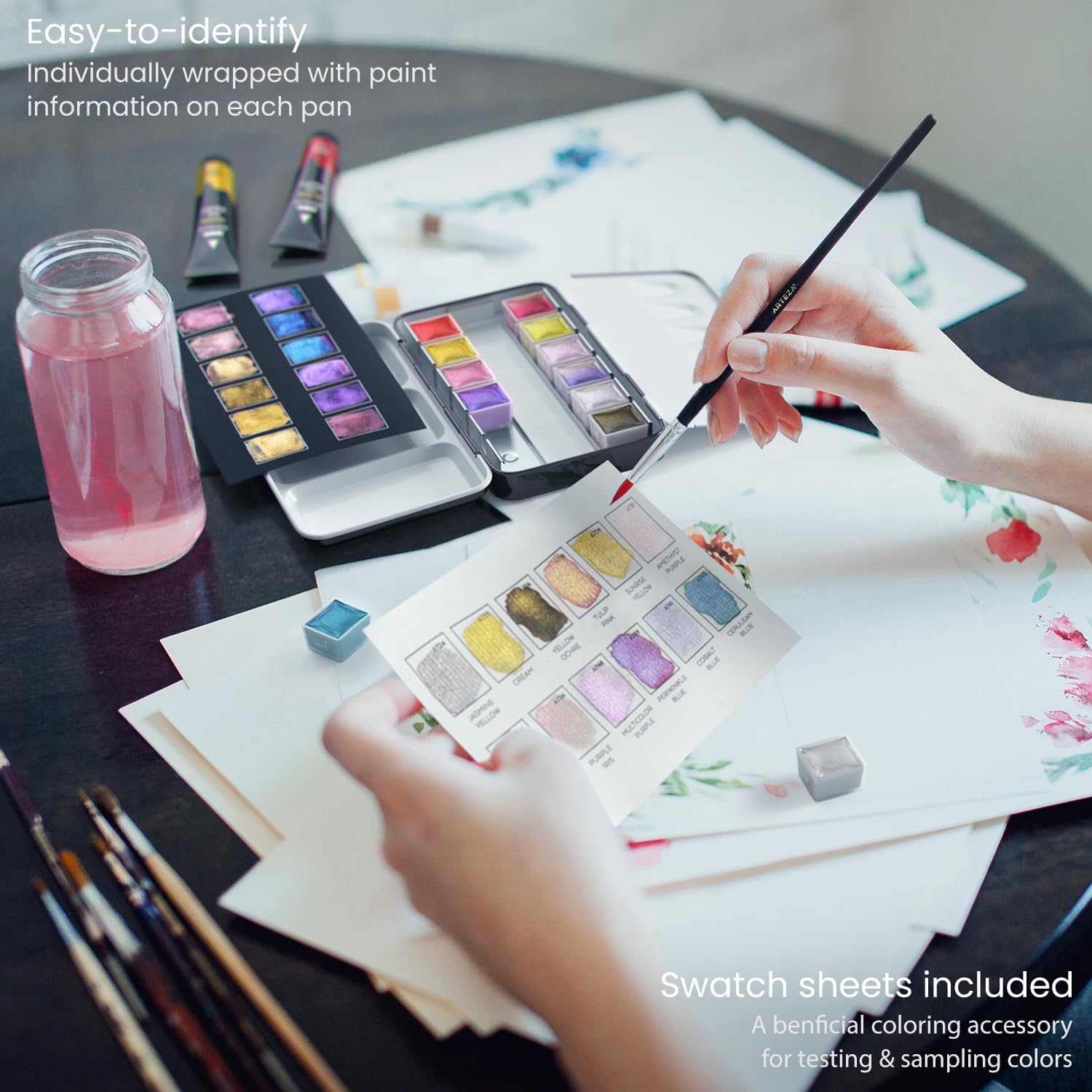 ARTEZA Metallic Watercolor Paint Set – 12 Iridescent Half Pans, Compact Travel Palette with Brush for Painting, Journaling & Mixed Media