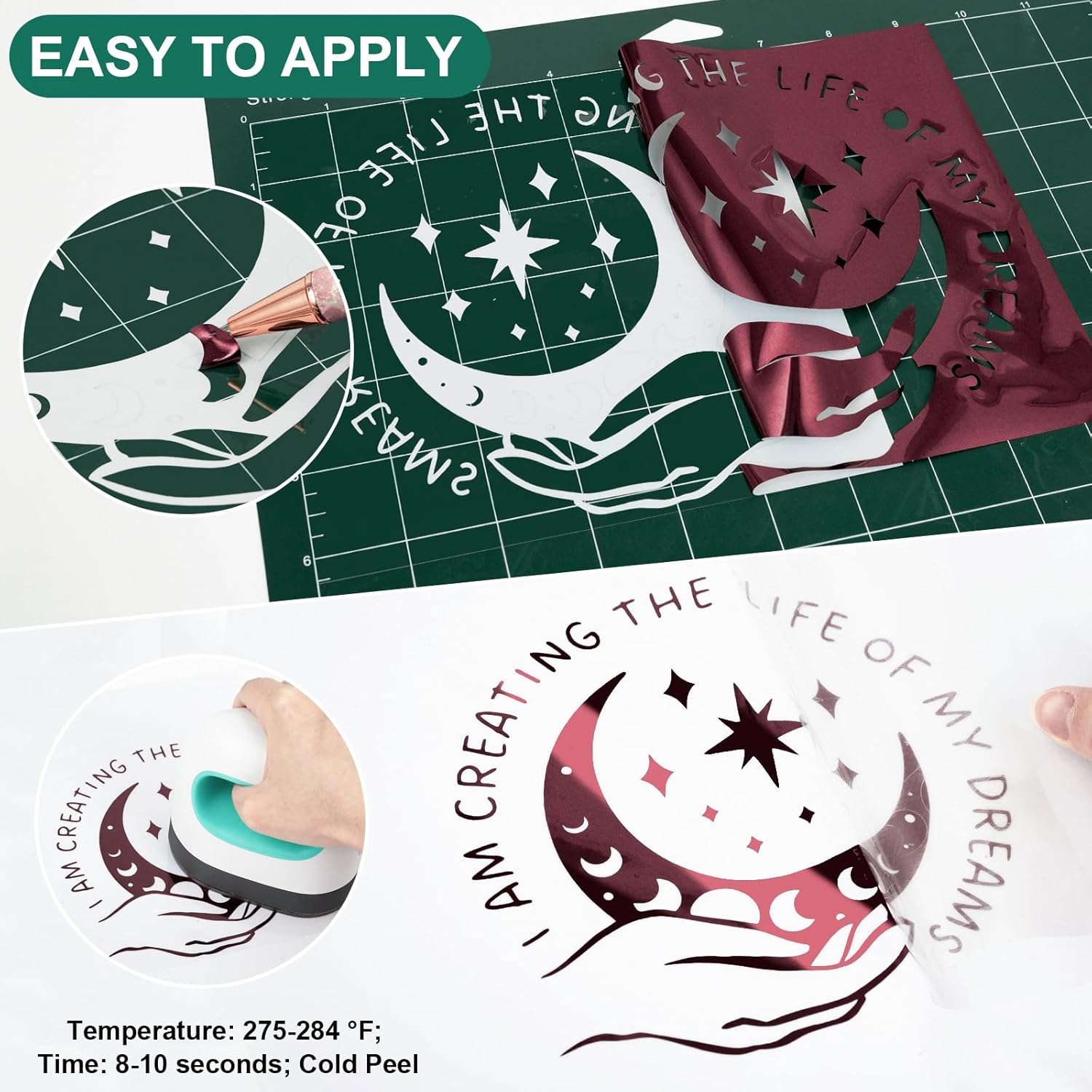 - ✨ EASY TO APPLY: Just use craft cutting machine and a home iron to get the job done. Apply for approximately 10-12 seconds at 266-284°F (130-140°C) and about 10 LBS of pressure. Be sure to cold peel.