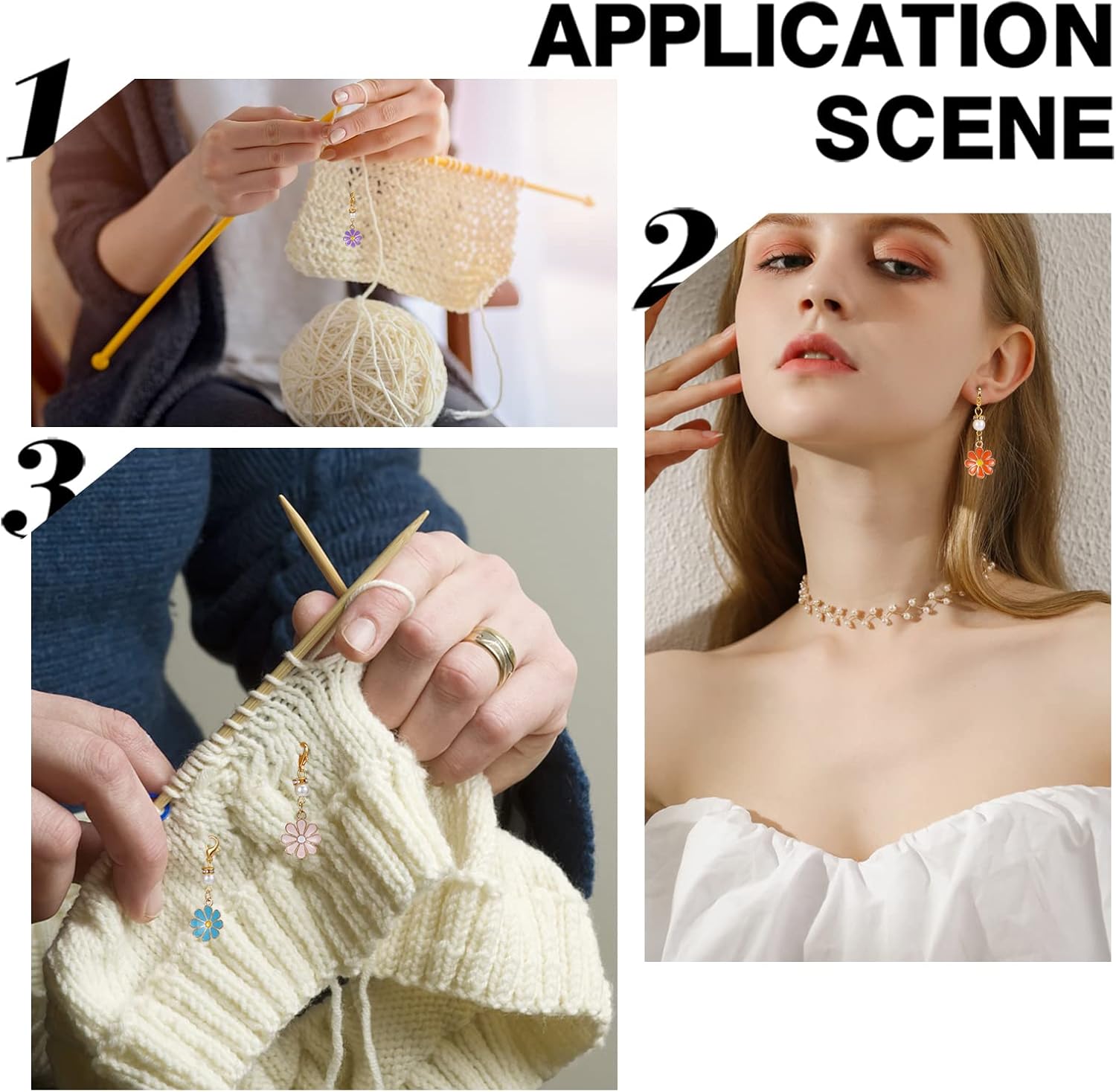 - FUNCTION: Daisy flower charms imitation pearl beads knitting stitch markers are helpful for sewing, weaving and knitting etc. The markers are must have tools to reposite where the knitting pattern starts and ends, to know where you need to repeat or change weaving. Just need to clip the charms on knitting wool to mark it. Removeable and able to be reused