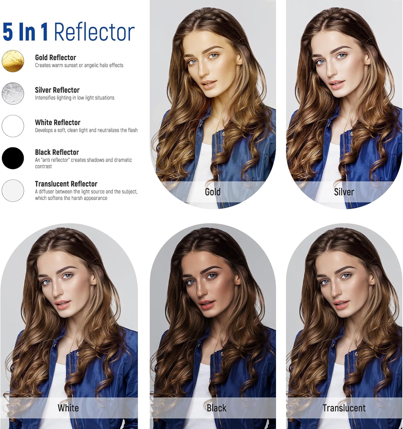 - 【Versatile 5-in-1 Reflector Diffuser Kit】This RF-30 5-in-1 reflector kit includes a translucent panel for light diffusion and a reversible sleeve providing four color effects: gold for hot fills, silver for fresh and crisp fills, white for soft neutral fills and black for eliminating excessive reflections