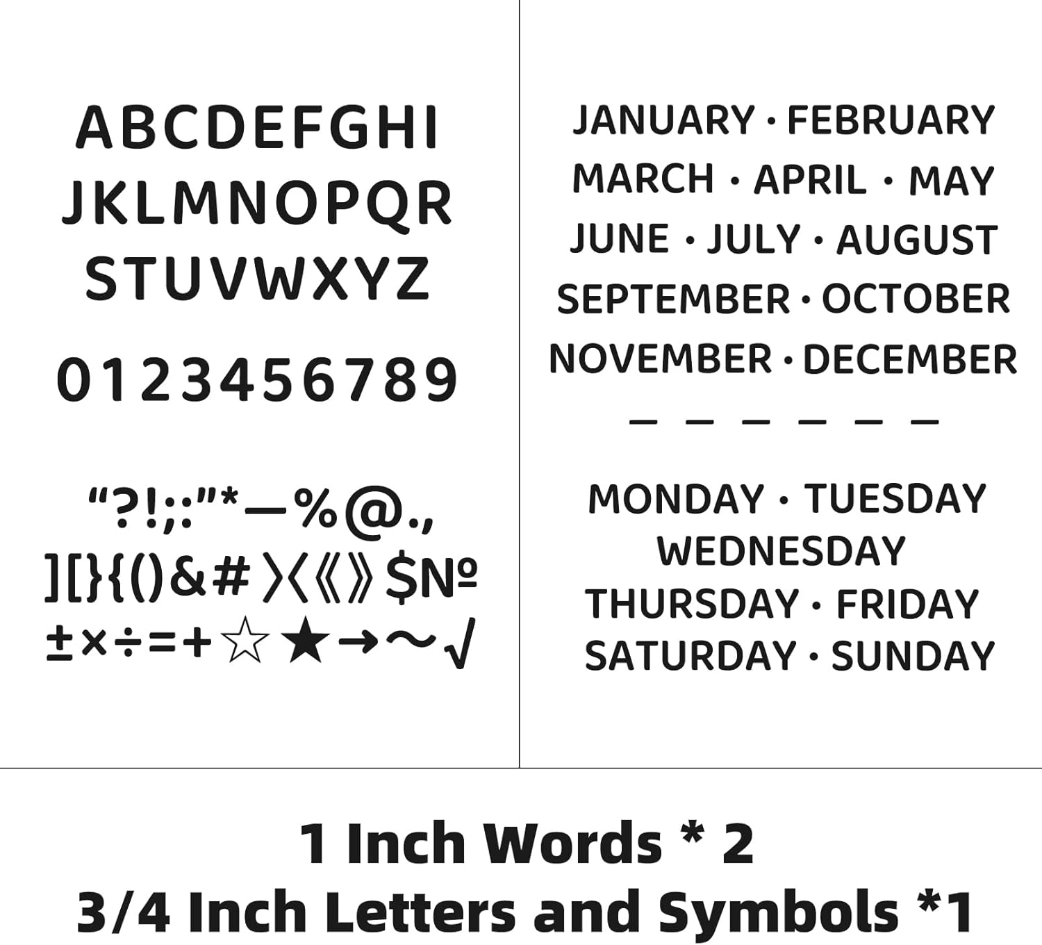 - 126 PCS/Set Of 1 Inch Letters Including:A - 6, B - 2, C - 2, D - 2, E - 7, F - 2, G - 2, H - 3, I - 6, J - 1, K - 1, L - 4, M - 3, N - 4, O - 6, P - 3, Q - 1, R - 4, S - 4, T - 4, U - 4, V - 1, W - 2, X - 1, Y - 2, Z - 1, 0 - 2, 1 - 2, 2 - 2, 3 - 2, 4 - 2, 5 - 2, 6 - 2, 7 - 2, 8 - 2, 9 - 2,Symbols :Comma-5, Period-4, Arrow-1,Dollar-1, Ampersand-1, @-1, Hashtag-1, Percent Sigh-1, Dash-1, House-1, Tick-1, Asterisk-1, Male-1, Female-1, Music-1, Thunder-1, Flower-1, Backslash-1, Triangle-1, Heart-1.