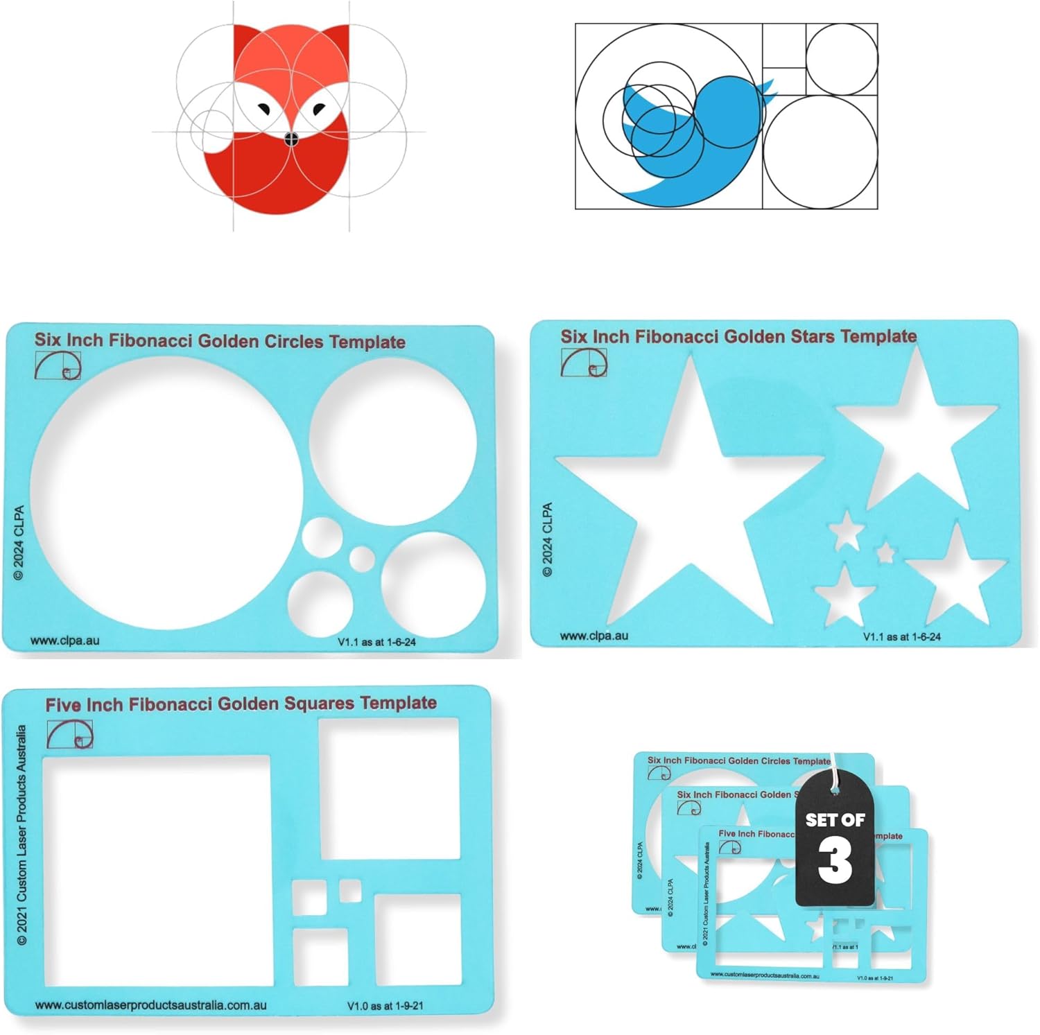 Fibonacci Template Set - Set of Stencil Templates for Drawing: 6" Circle, 6" Star, 5" Square Fibonacci-Inspired Set of Templates for Drawing Tool for Artists