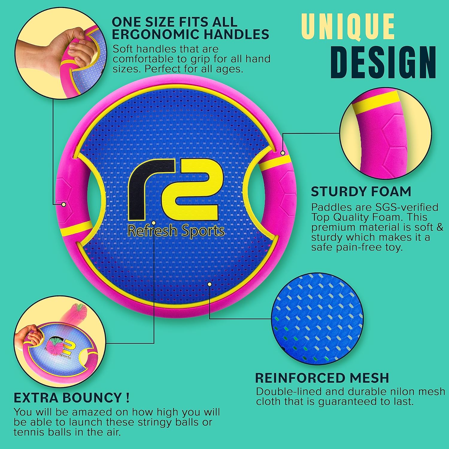 • π— π—¨π—Ÿπ—§π—œπ—£π—Ÿπ—˜ π—šπ—”π— π—˜π—¦, π—’π—‘π—˜ π—¦π—˜π—§: Easy to pick up and play Badminton, Tennis, Baseball, and so much more! With the stringy balls and paddle's bouncy mesh, you can easily transition between games that would normally require separate equipment. You can even swap the rubber balls for water balloons on hot summer days for some extra splashy fun!