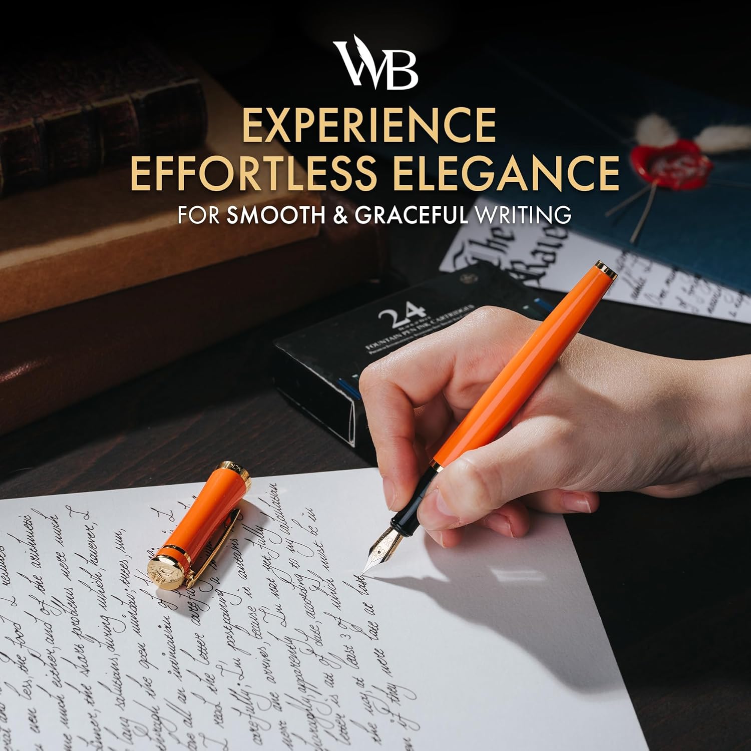 Wordsworth & Black Fountain Pen Set, 18K Gilded Medium Nib, Includes 24 Pack Ink Cartridges, Ink Refill Converter & Gift Box, Gold Finish, Calligraphy, [Orange], Perfect for Men & Women