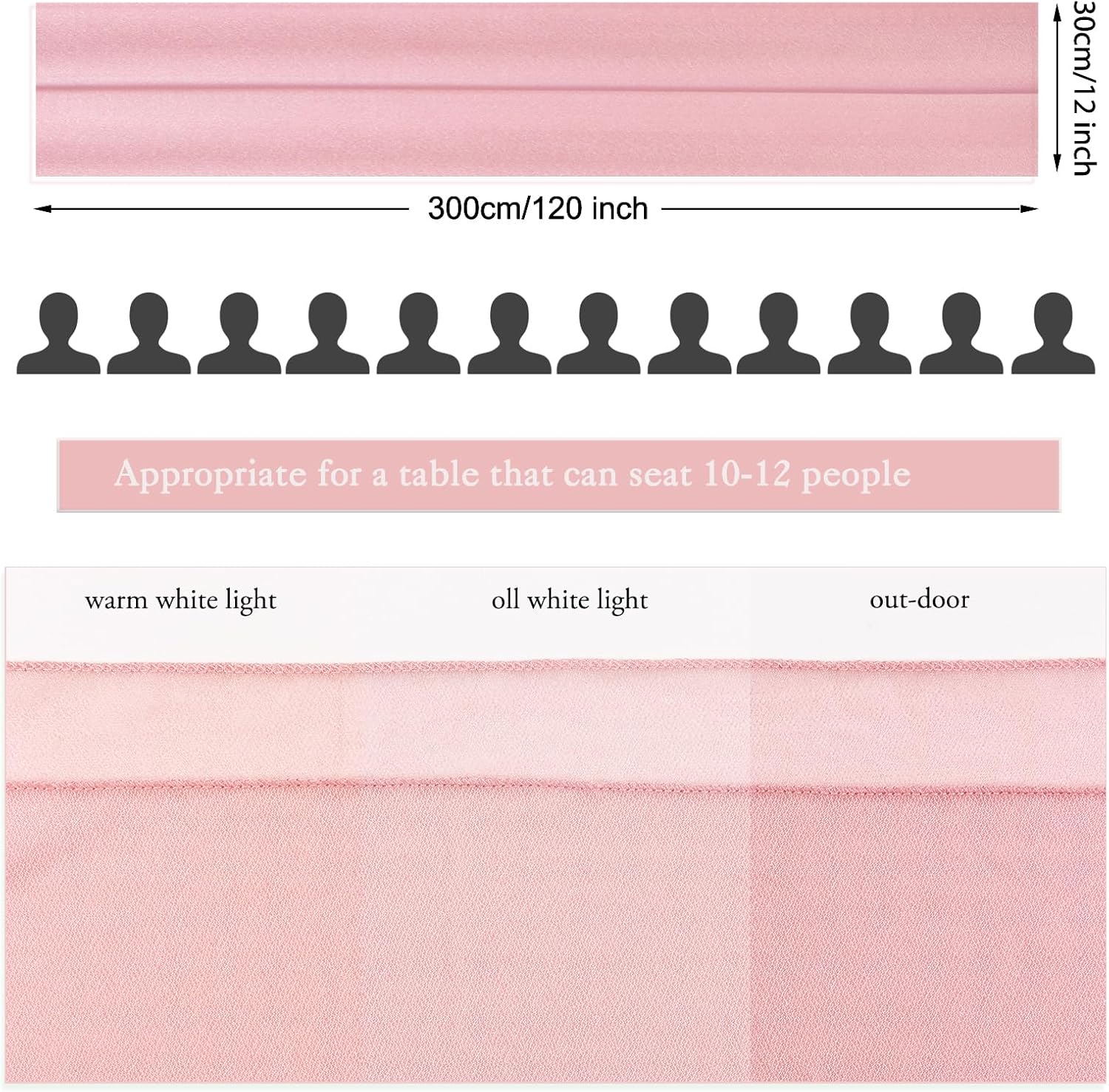 - Package: Pack of 1 chiffon table runner, Size: 12" W x 120" L,about 10Ft ,comes with 2 white ribbons.which is large enough to cover rectangles and round tables, can also be spliced together for long tables. The rustic table linen with gorgeous finished edges drapes gracefully across long, round or other tables.