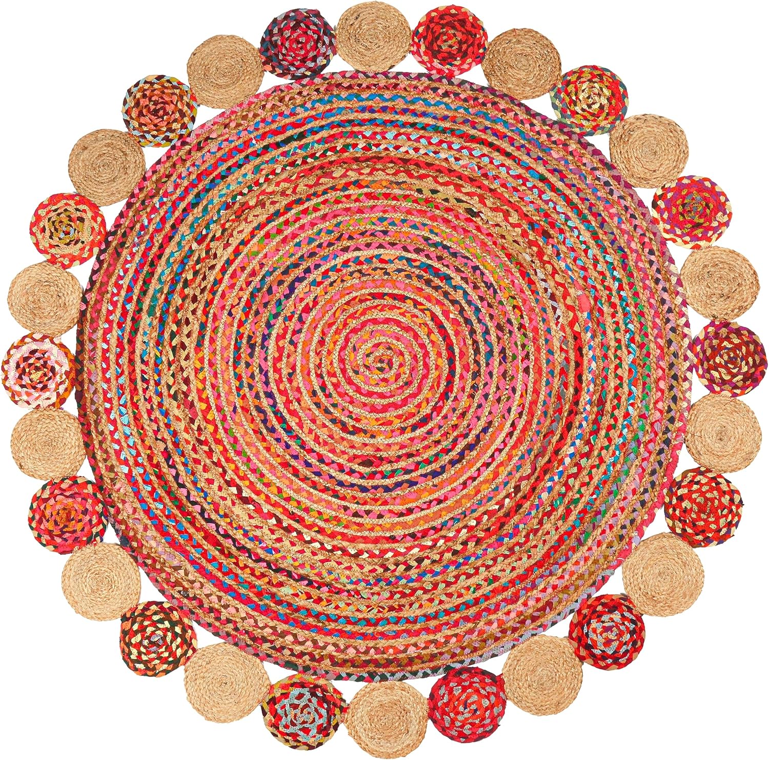 5' Round Handwoven Jute Chindi Area Rug - Colorful Boho Rugs for Living Room - Hand Braided Multicolor Bohemian Rug for Farmhouse, Bedroom, Dining Room, Classroom, Hallway, Kitchen, Office