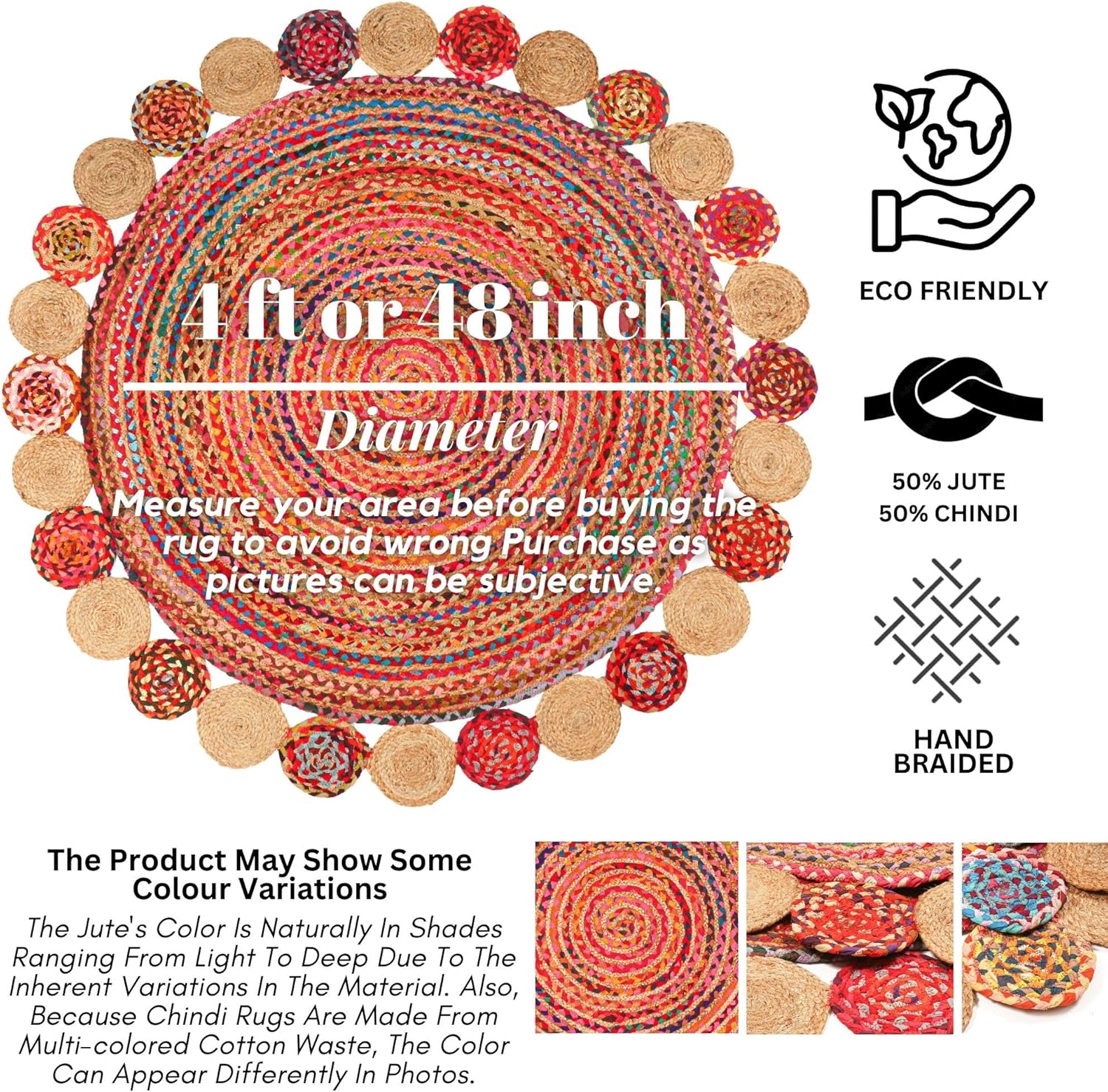 4' Round Handwoven Jute Chindi Area Rug - Colorful Boho Rugs for Living Room - Hand Braided Multicolor Bohemian Rug for Farmhouse, Bedroom, Dining Room, Classroom, Hallway, Kitchen, Office