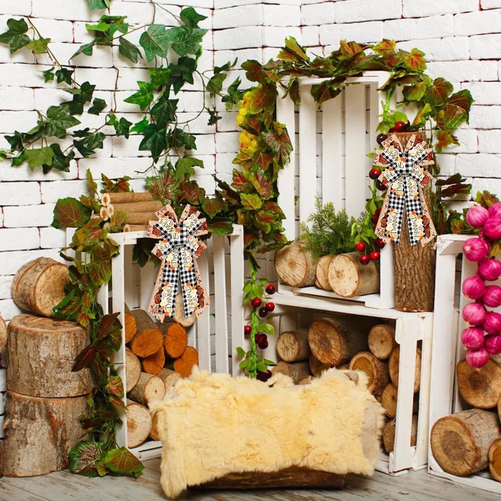 Threetols 2 Rolls 10 Yards Fall Wired Edge Ribbons, 2.5inch Black White Plaid Burlap Ribbon, Autumn Leaves Gnomes Pumpkin Ribbon for Thanksgiving Party DIY Craft Fall Wreath Bow Decor