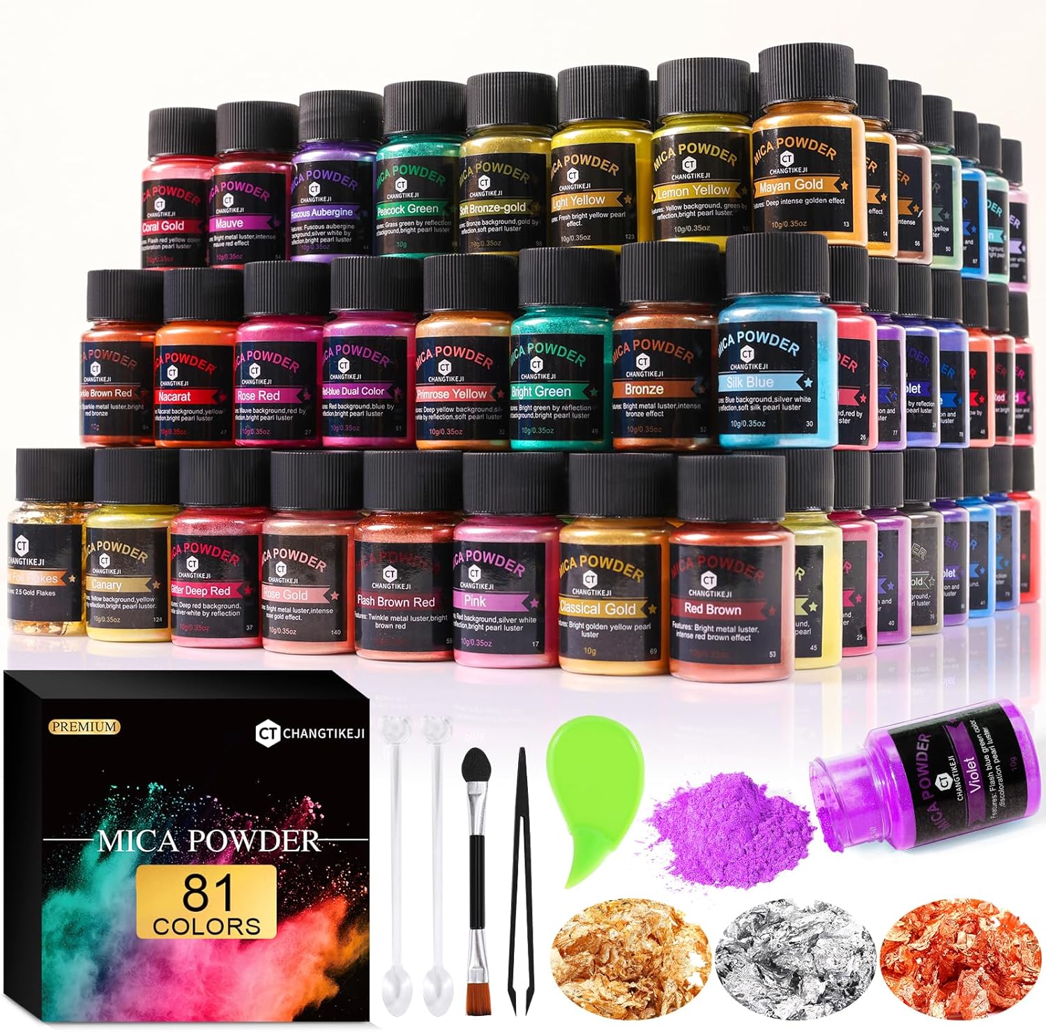 CHANGTIKEJI Mica Powder - 81 Colors - 10g/Bottle of Natural Pigment Powder for Epoxy Resin,Soap Making,Candle Making,Car Freshies,Dye,Nail Polish,Bath Bombs