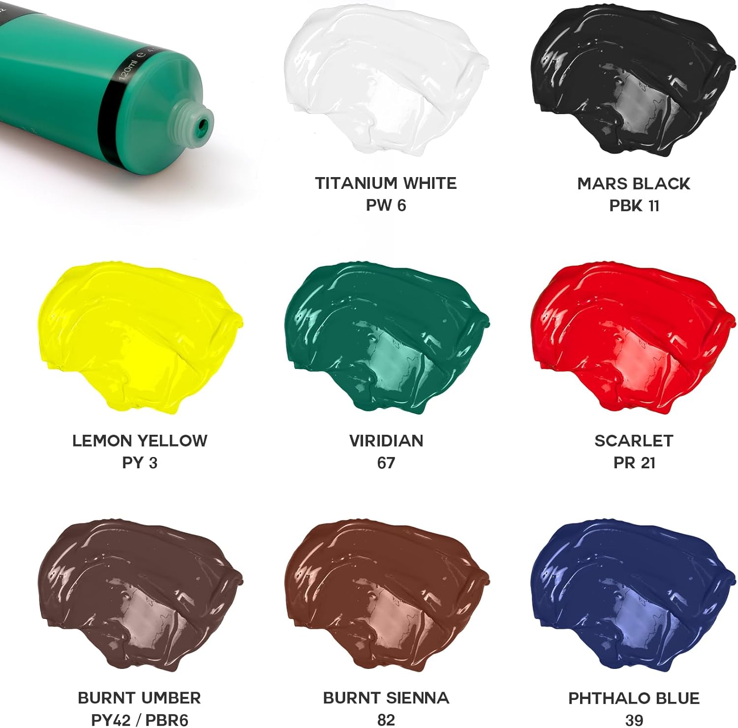 - 8 Primary Colors: Titanium White, Black, Scarlet, Sap Green, Lemon Yellow, Cerulean Blue.