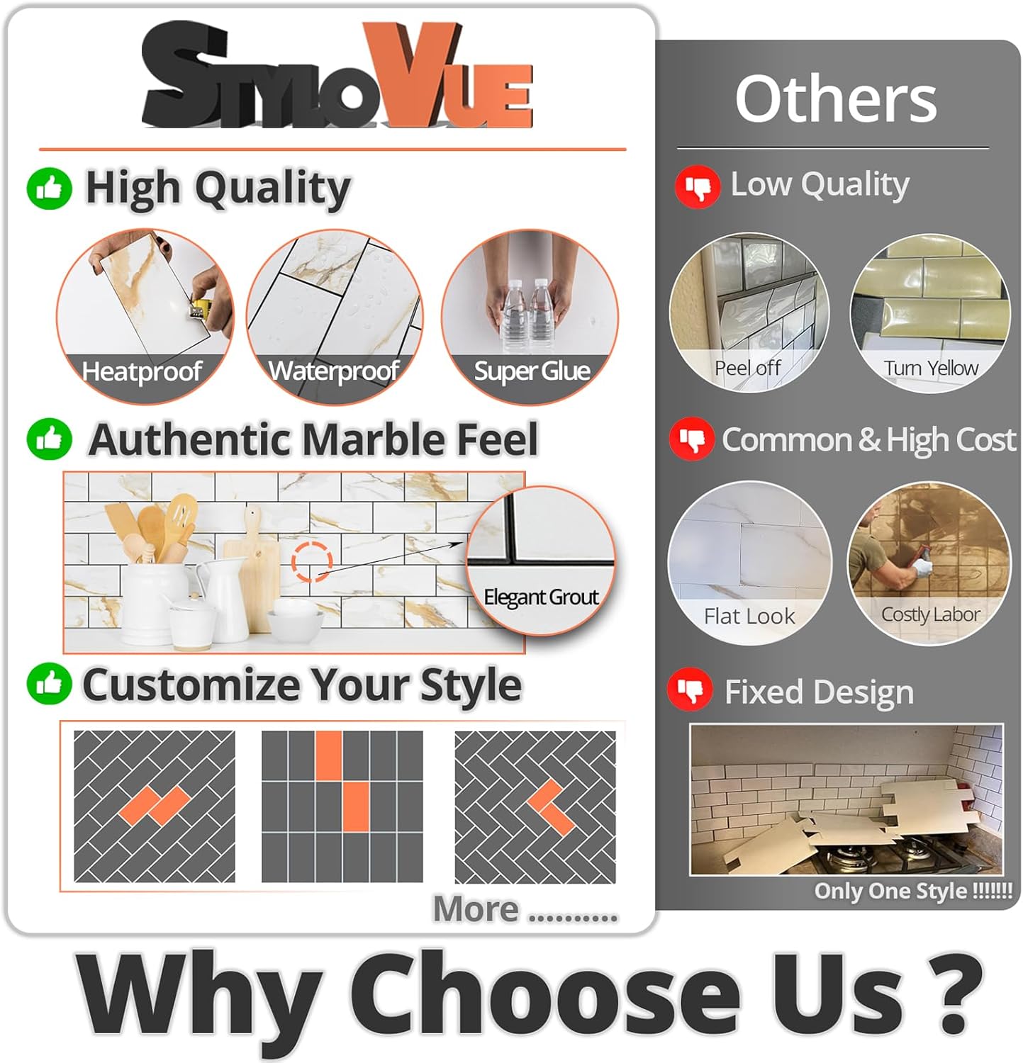 - ๐๐ฅ๐๐ฏ๐๐ญ๐ ๐๐จ๐ฎ๐ซ ๐๐ฉ๐๐๐: Featuring unique slot edges for a realistic grout-look, StyloVue self adhesive wall tiles offer an authentic design and texture that customers adore. Elevate the aesthetic of your space while simplifying maintenance and cleaning, without the hassle of traditional grouting.