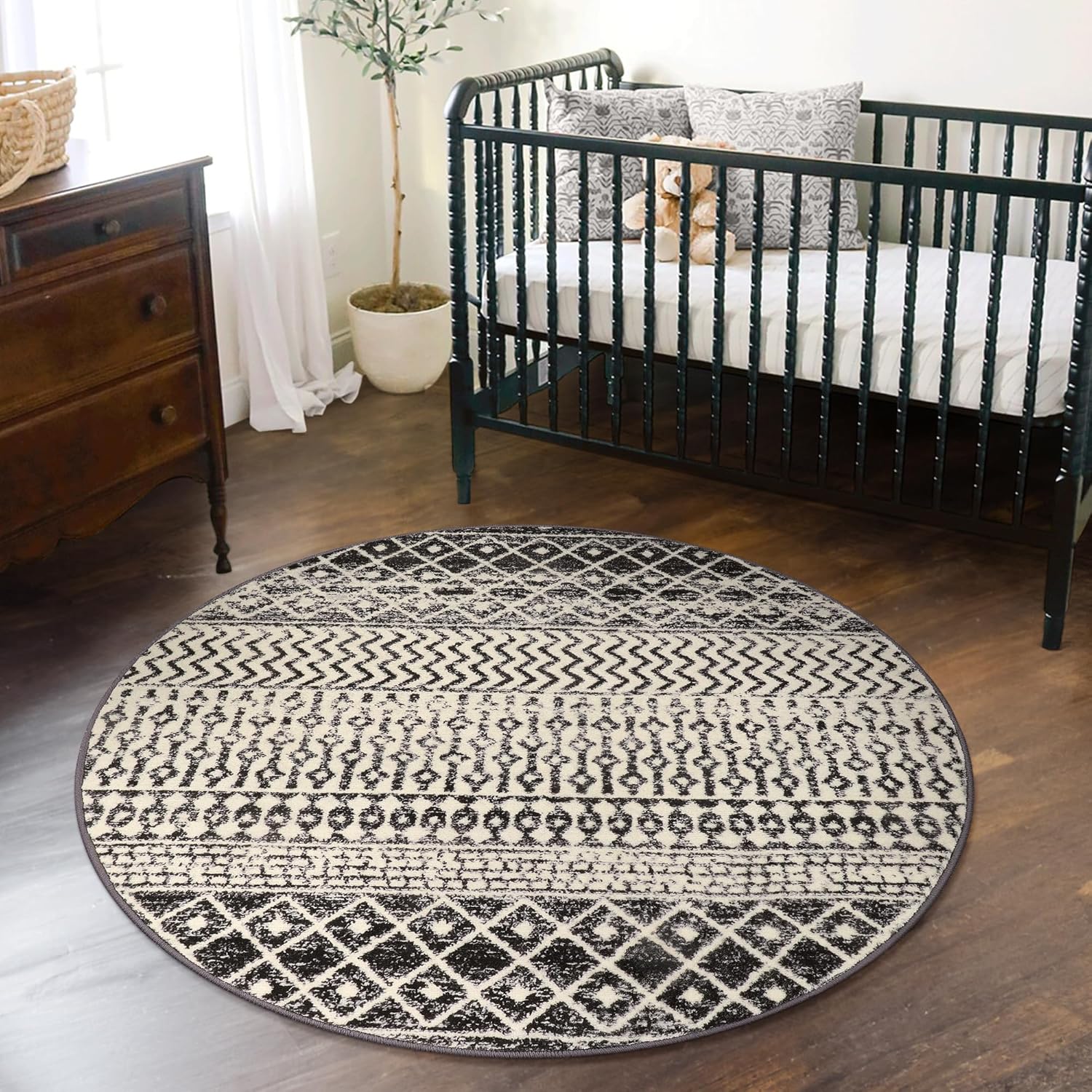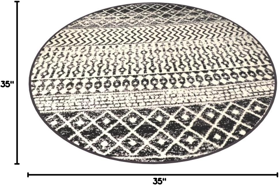 Moroccan Round Rug 3ft, Black Distressed Entryway Rug Non-Slip Circle Rug, Washable Non-Shedding Throw Rugs Indoor Door Mat for Bedroom Bathroom Kitchen Laundry Room Nursery