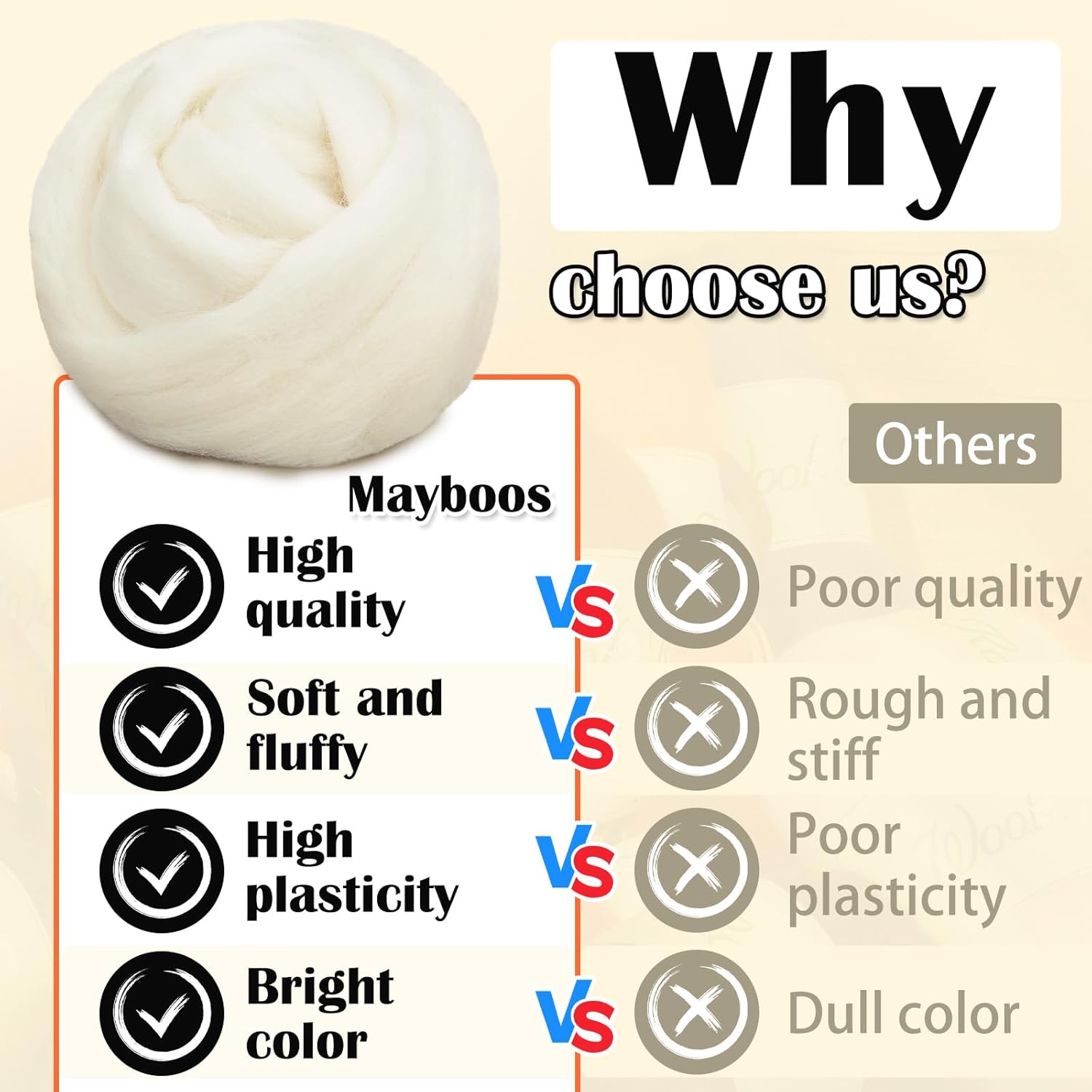 Mayboos Wool Roving Yarn, 1.76oz Colored Natural Wool Roving,Wool Felting Supplies Pure Wool Chunky Yarn for Wet Felting handcrafts and Spinning (White Color)