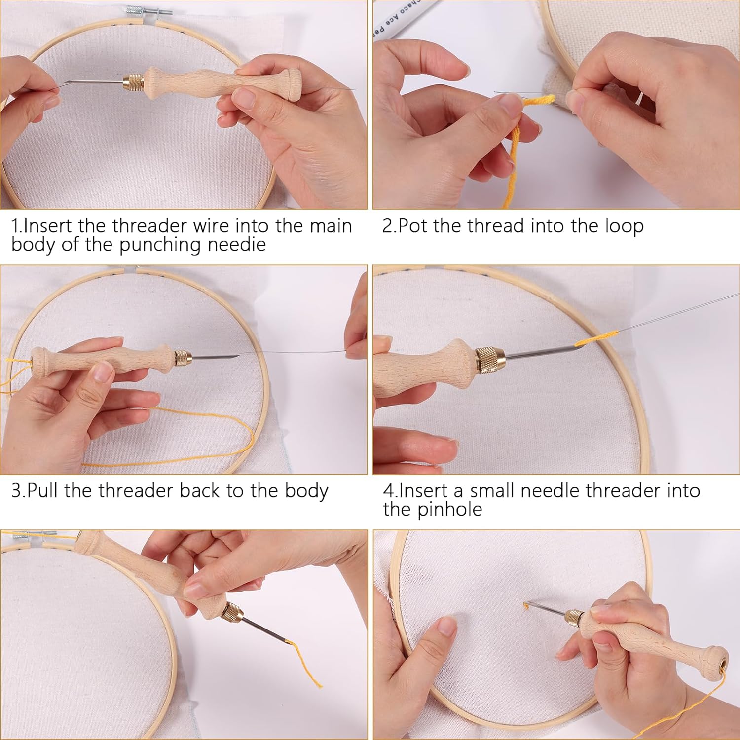- Punch Needle Beginner Kit: 1pcs embroidery hoop, 1pcs adjustable punch needle with 3 needles, 1 pcs monks cloth, 1 pcs linen cloth, 1pcs mark pen, 1 pcs Scissors, 9 pcs Needle, 2 pcs threaders and instructions. You don't have to worry about buying any additional tools or accessories