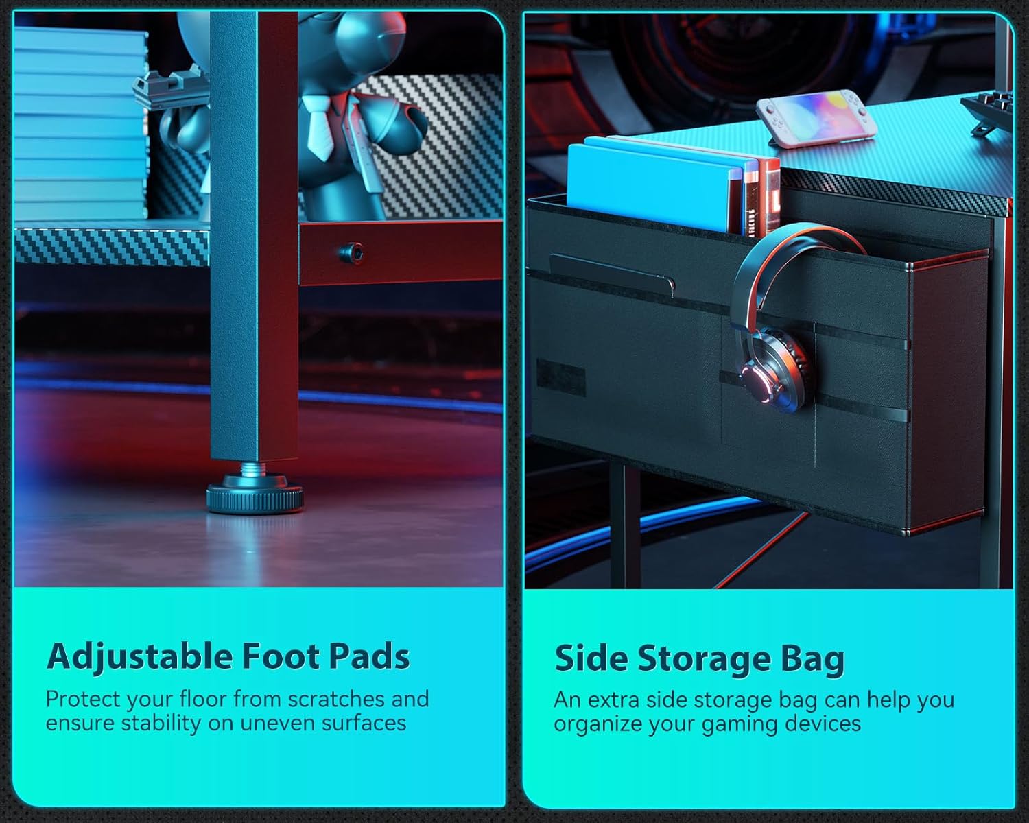 - ăSuper Ample Storage SpaceăWith Two-tier open shelves and PC stand providing maximally ample space for your PC case, books, files, devices for convenience usage, and side storage bag helps you store gaming devices or office stuffs.