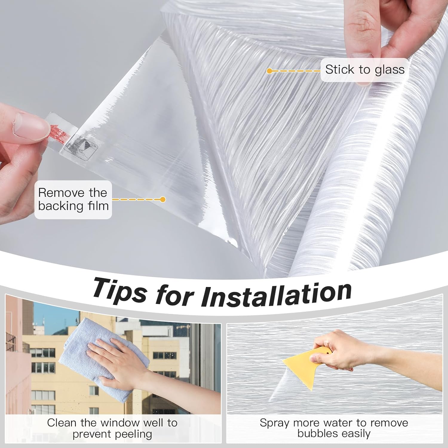 - Anti-Peeping: By featuring a textured surface, our window frosting film provides a semi-privacy solution that effectively blurs vision and only allows the outlines of objects to be visible. Say goodbye to tightly closed curtains during the day and bask in the warm, natural light without sacrificing your privacy