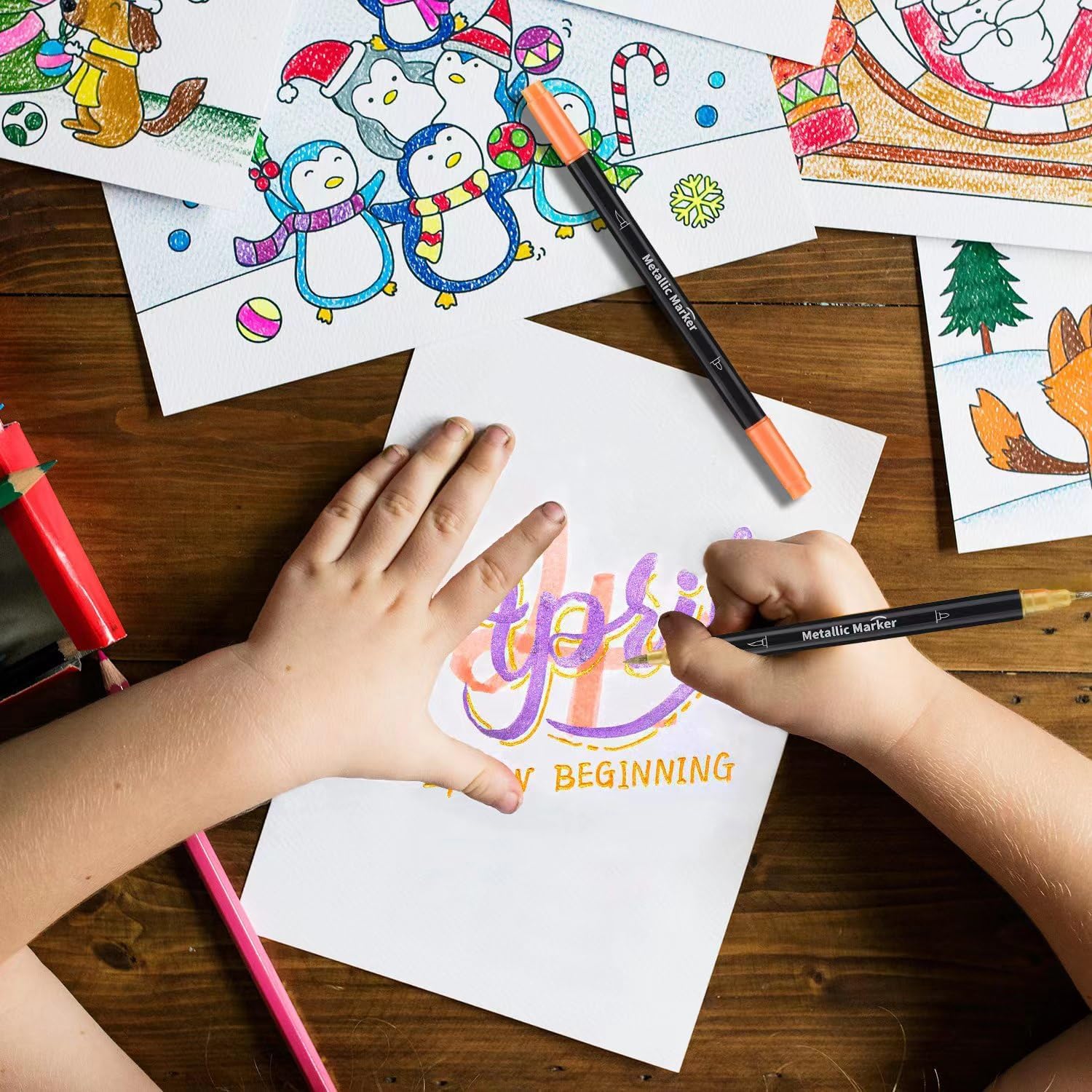 Colourcolor Pack of 12 Metallic Marker Pens - Dual Tip Brush & Fine Point Pens for DIY Album, Black Cards, Rock Painting, Card Making, Scrapbooking, Fabric, Metal, Ceramics, Wine Glass