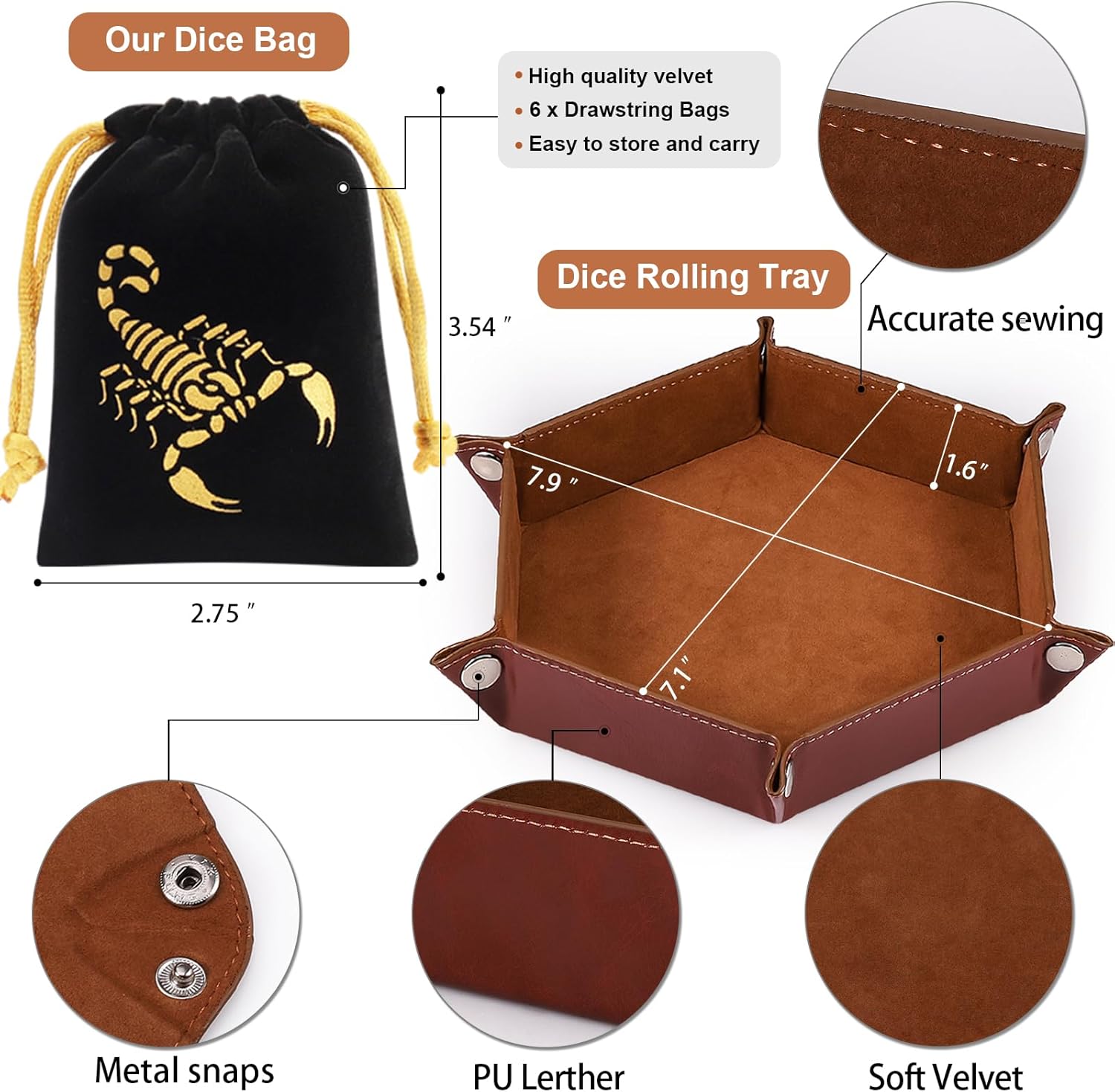 - Polyhedral dices set: Comes with 6 sets of Polyhedral Dice with 7 pieces in each set, (Each dice set includes D4, D6, D8, D10, D%, D12, and D20); 6 velvet dice bags, 1 Portable Folding Dice Rolling Tray.