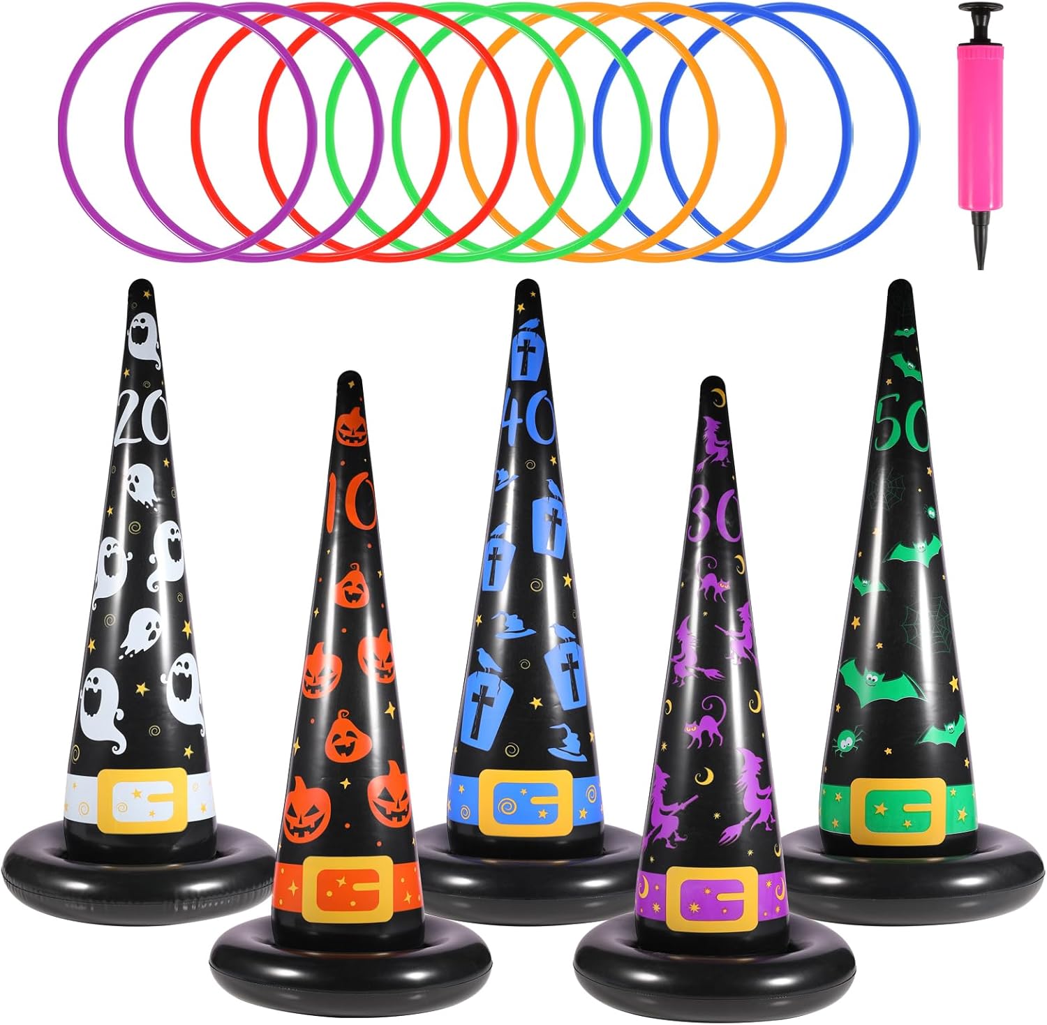 Halloween Ring Toss Game Set, 5Pcs Inflatable Witch Hats with 10Pcs Colorful Plastic Rings and Air Pump for Halloween Party Games Super Fun Indoor Outdoor Party Supplies