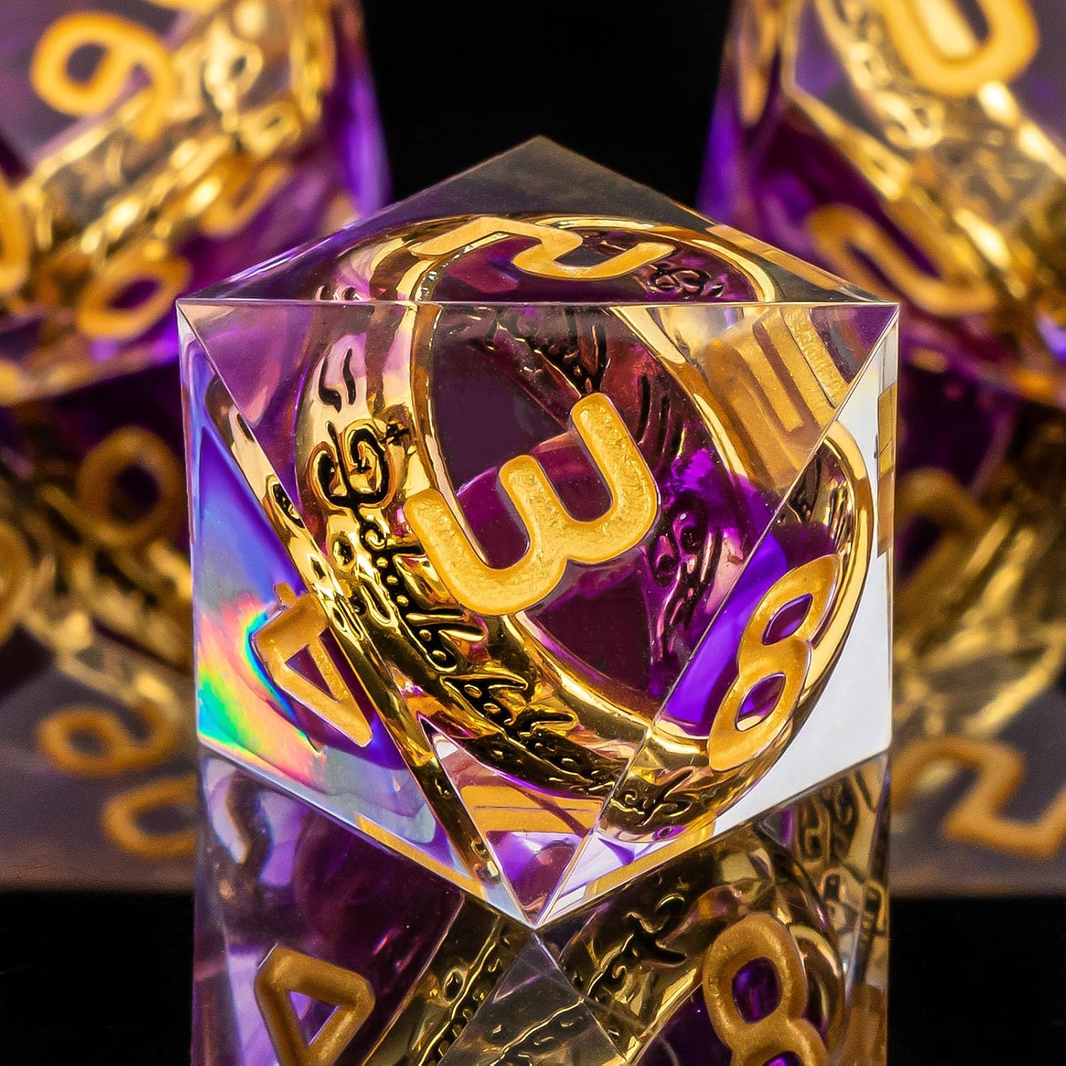 OUKELANWO Magic Lord Rings DND Dice Set with Box, 7Pcs Resin LOTR D&D Dice Set for Role Playing Game, Purple Gold Dungeons Dragons D and D Sharp Edge Dice D20 D12 D10 D8 D6 D4
