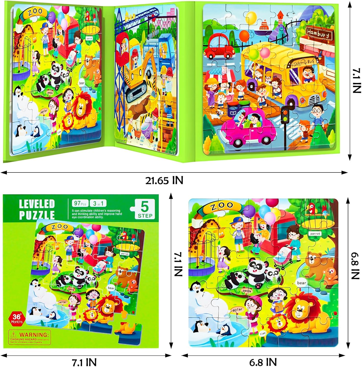 - 3 IN 1 KID PUZZLE: This set of cartoon magnetic puzzle has 3 parts with colorful images.There are 25, 30 and 42 puzzle pieces, 97 in total, ranging from easy to difficult, full of fun and challenges, helps kid develop motor skills and improve logical think