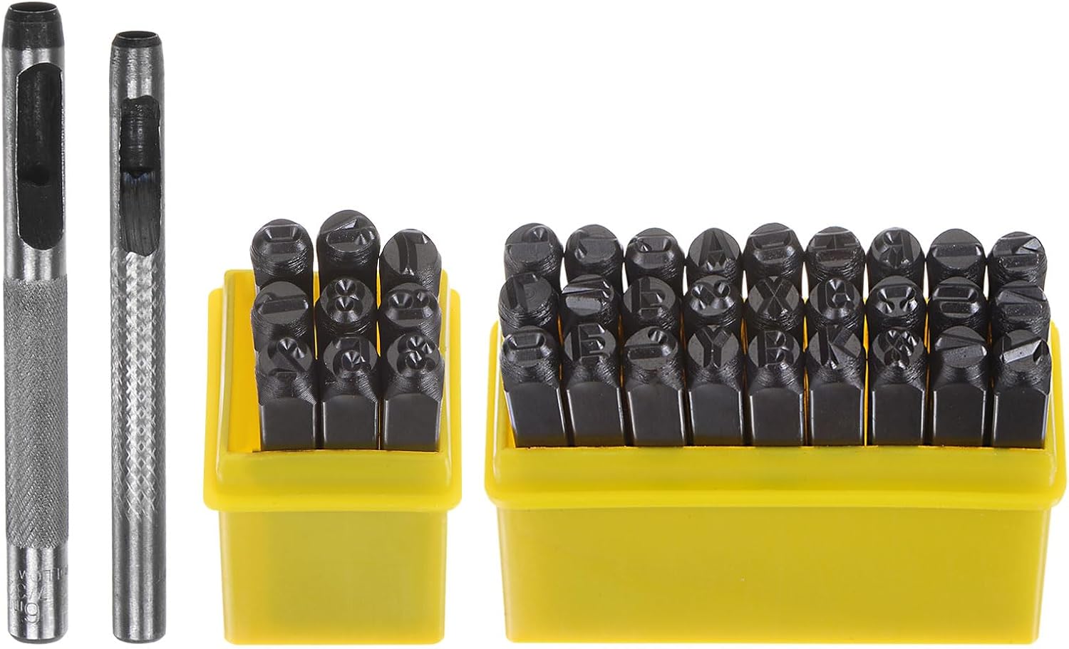 - Metal Stamping Kit - Contains 36pcs of metal punch stamps (26 capital letters from A to Z, numbers from 0 to 8 , an "&" Symbol) sized 3/16" (5mm) of each, and 2 sizes of hole punches.