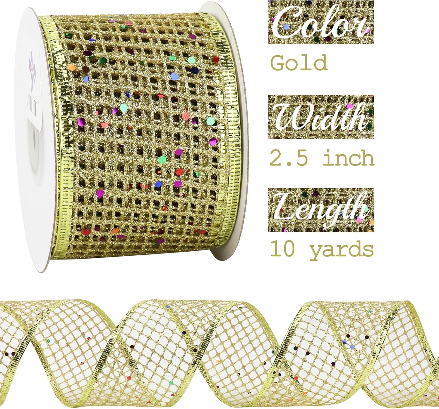 - Our ultra-sparkly ribbon is crafted from fine gold glittered square netting, embellished with chunky rainbow disco glitter, and elegantly finished with silver foil edges. This ribbon features a stunning gold glitter design that is sure to capture attention and add a touch of sparkle to any project. With a generous length of 10 yards and a width of 2.5 inches, this ribbon provides an ample supply of material for all your crafting and decorating needs.