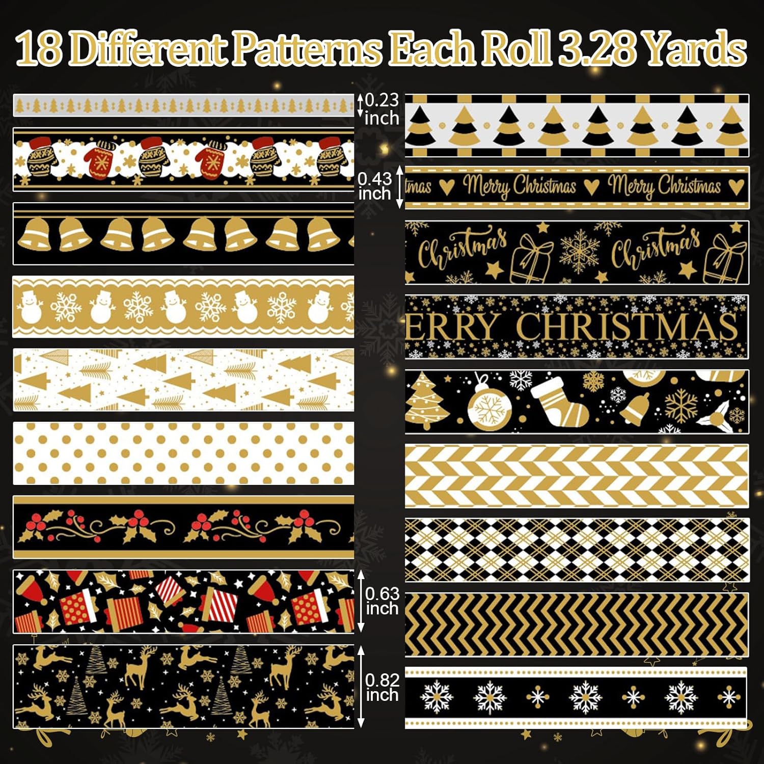- Gold Silver Foil Decorative Tape: Printed with many kinds of patterns, such as Jingle Bells,Christmas Stockings, snowflakes, elk, Christmas tree and so on, bringing you a joyful festival atmosphere.