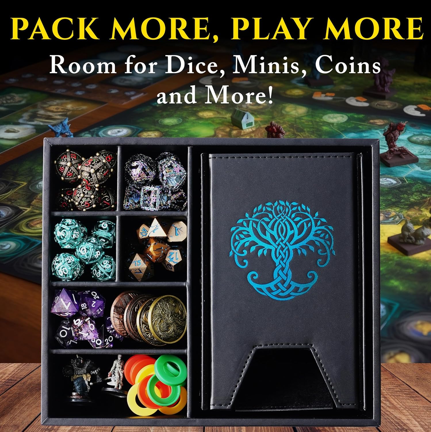 - ALL IN ONE COMPACT BOX: Optimize space, organize efficiently, and store more game items - each square slot holder can accommodate 2 sets of standard game dice, or larger metal dice sets compatible with DND, mini's, coins and more. (*Dice and accessories not included)