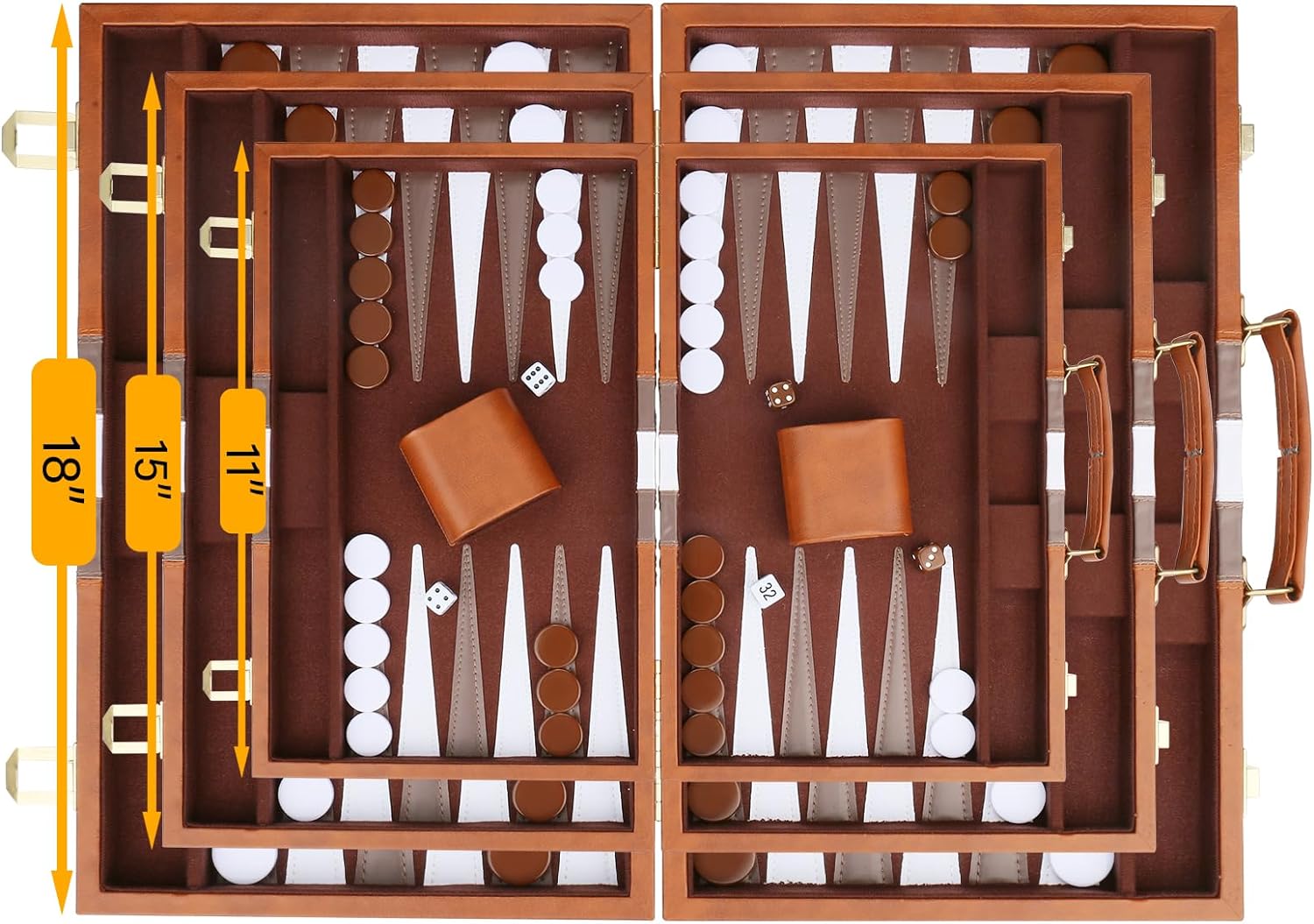 Backgammon Set - Classic Board Game with Premium Leather Case - Portable Travel Strategy Backgammon Game Set for Adults, Kids - Suitable as (15inch, Brown)