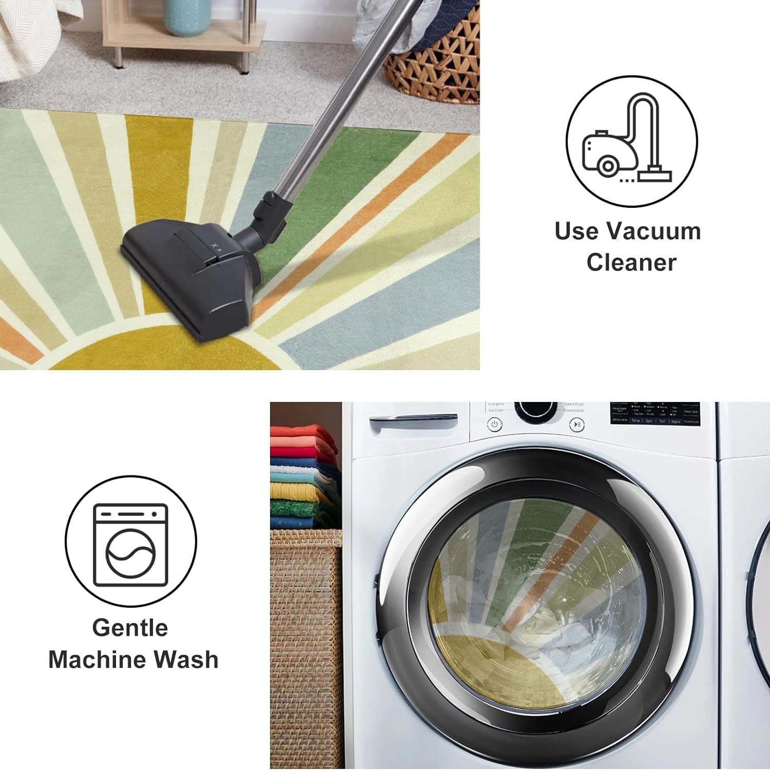 - Machine Washable:Gentle cycle wash in cold water is recommended,it can be tumbled in a dryer using the air-only cycle with no heat.Use a vacuum cleaner for daily cleaning.Use laundry bag to make the indoor rug more sturdy.