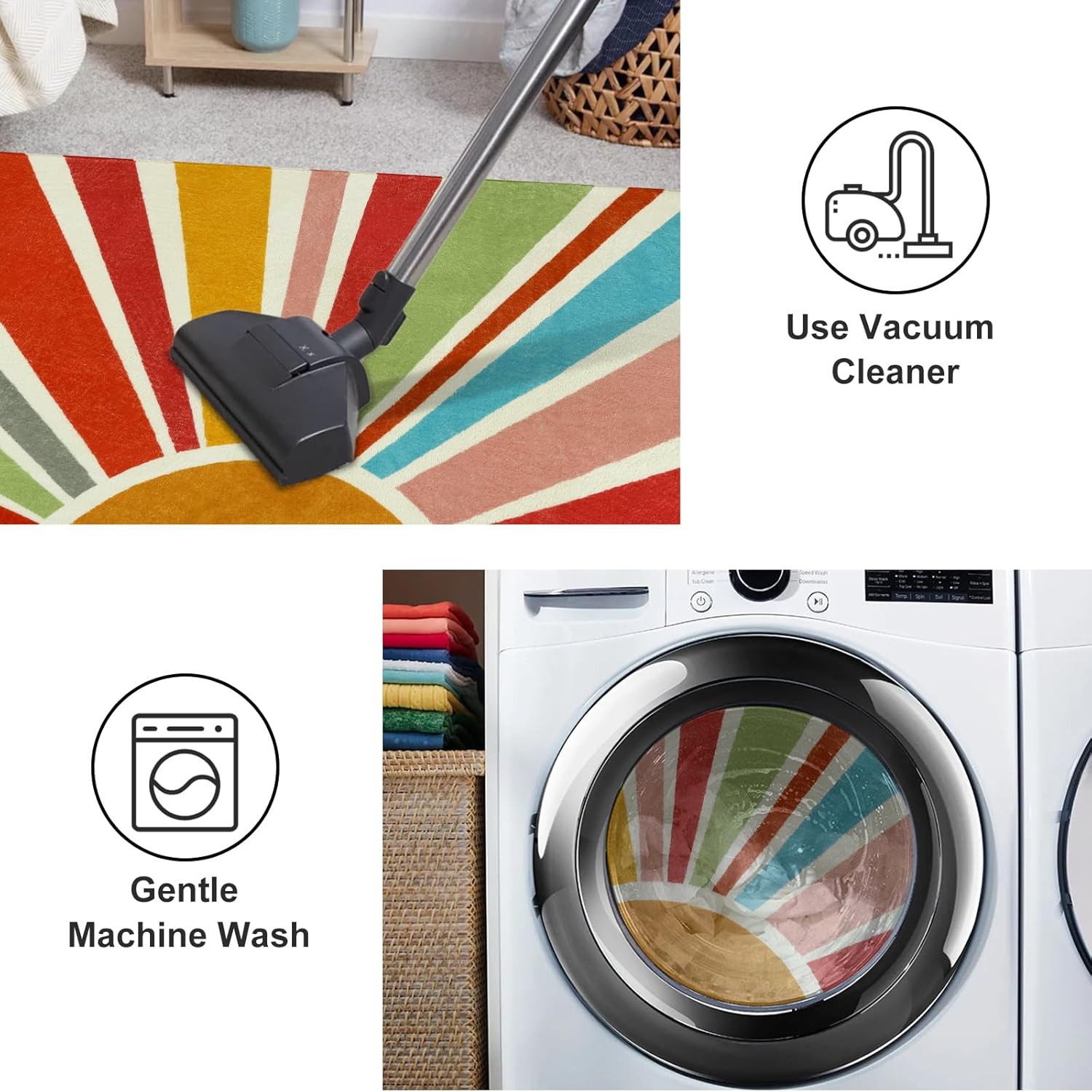 - Machine Washable:Gentle cycle wash in cold water is recommended,it can be tumbled in a dryer using the air-only cycle with no heat.Use a vacuum cleaner for daily cleaning.Use laundry bag to make the indoor rug more sturdy.