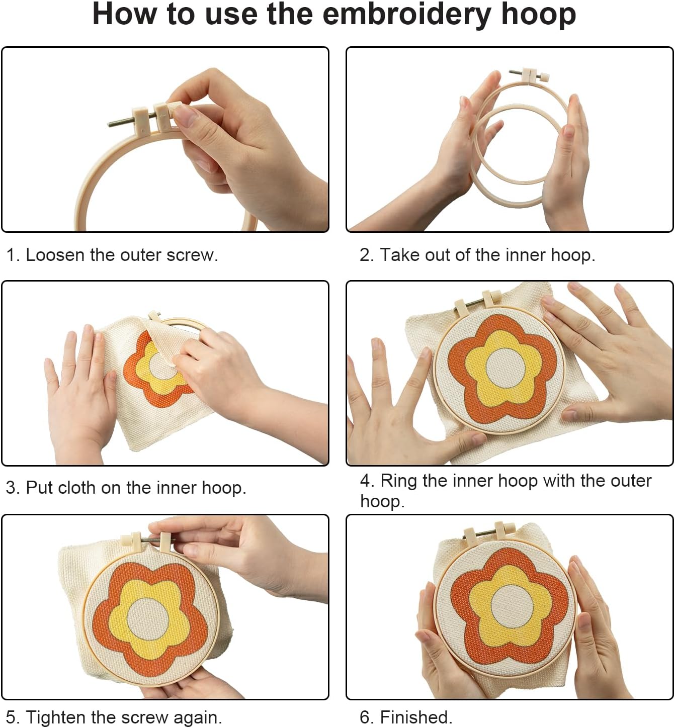 - [Punch Needle Kit] - 6 x stamped punch needle fabric, 1 x adjustable hoop, 1 x punch needle, 1 x sewing needle, 1 x instruction, 1 x scissor, 6x adhesive felt, 1 x needle-threading tool, and enough yarns.