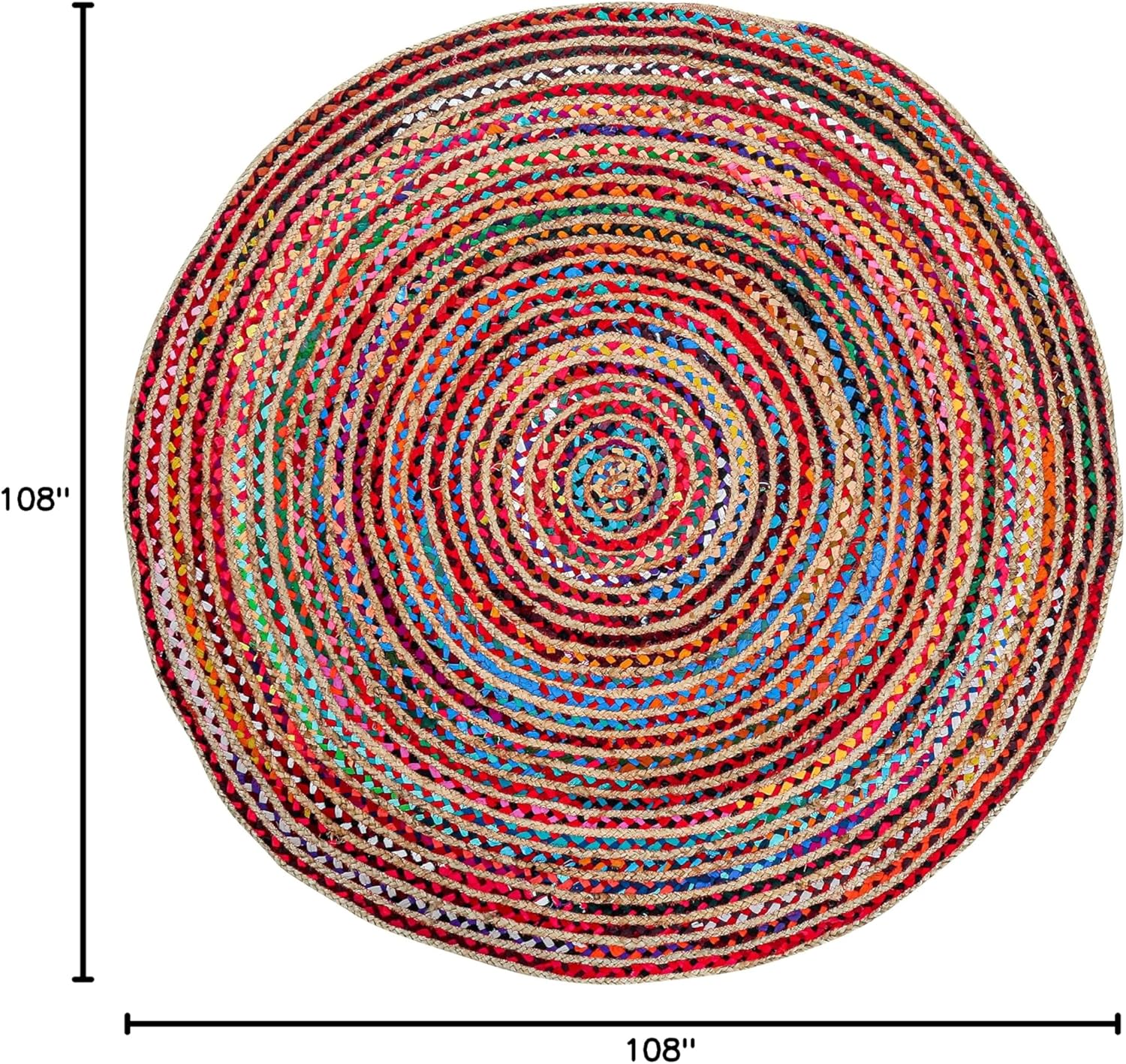 9' Round Handwoven Jute Chindi Area Rug - Colorful Boho Rugs for Living Room - Hand Braided Multicolor Bohemian Rug for Farmhouse, Bedroom, Dining Room, Classroom, Hallway, Kitchen, Office