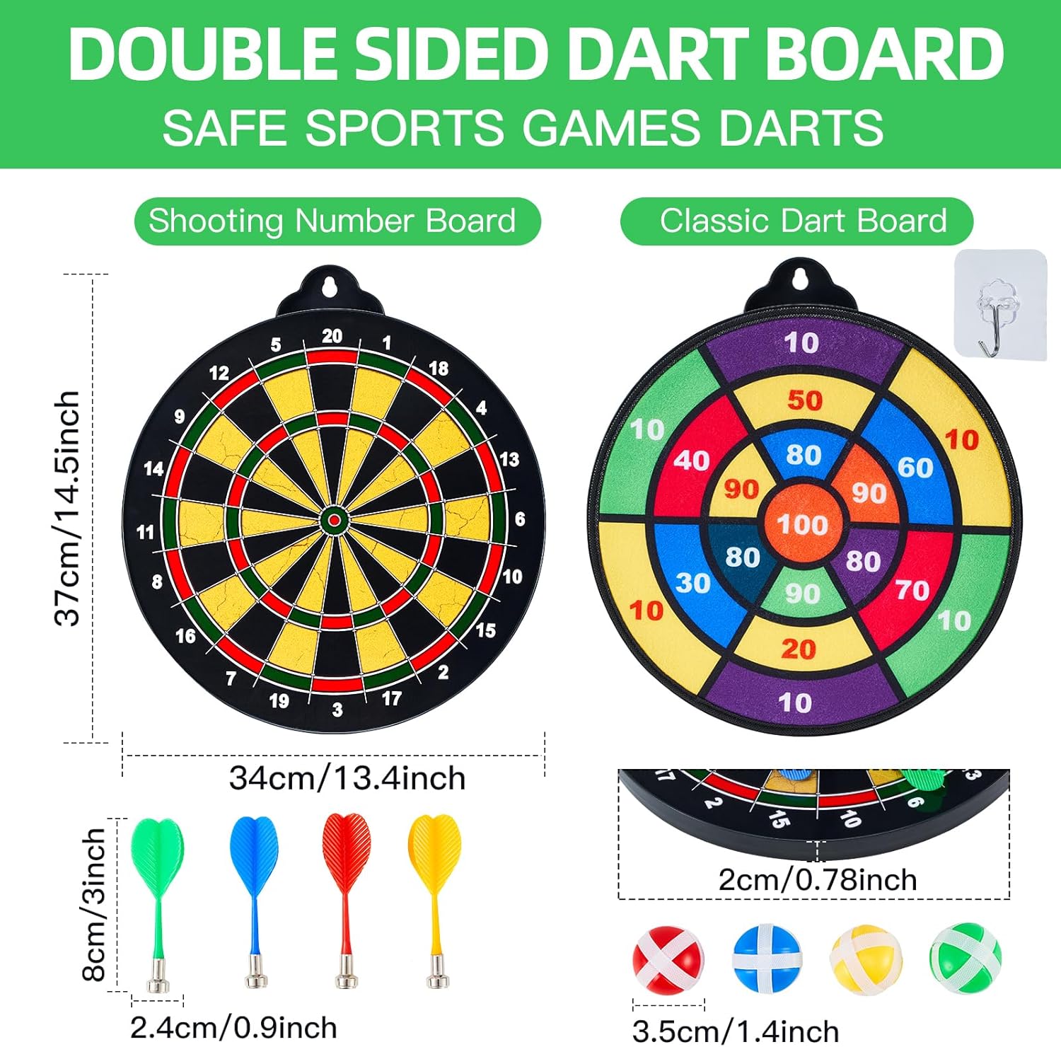 - [Multiplayer Dart Board Set]:Package contains a 14.5 inch strong and durable double-sided dart board, 12 pcs 4-color magnetic darts and 12 pcs 4-color darts sticky balls, which can let 2-4 players play together. This is a toy loved by adults and kids of all ages, great for family and party games.