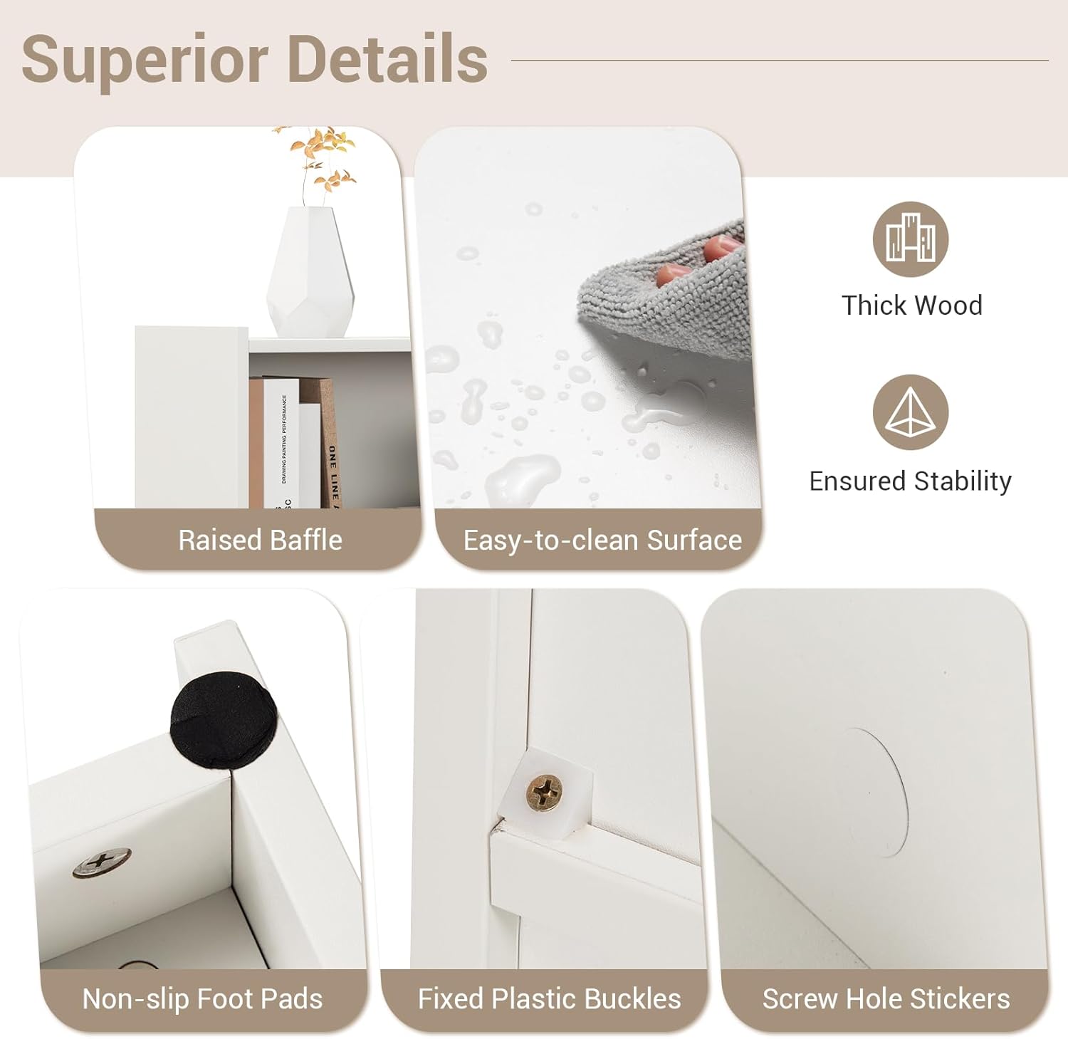 - Thoughtful Detail Design: The bookcase has non-slip feet on the bottom to protect the floor from scratches, and the base is 4 inches high thus blocking stains from the floor. In addition, the edges and corners of the horizontal cabinet are rounded to protect you and your family.