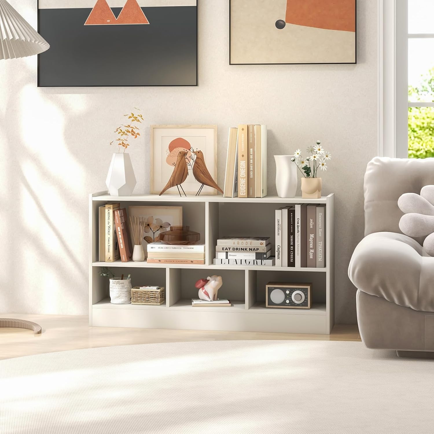 - Multi-functional Large Storage Space: This 5 Cube Open Storage Cabinet will meet a variety of your storage and display needs. With 2 large cubes measuring 21" x 11" x 11.5" (L x W x H), 3 medium cubes measuring 14" x 11" x 7" (L x W x H), and a 42" x 12" rectangular top, it's deep enough to hold a variety of books, toys, and everyday items.