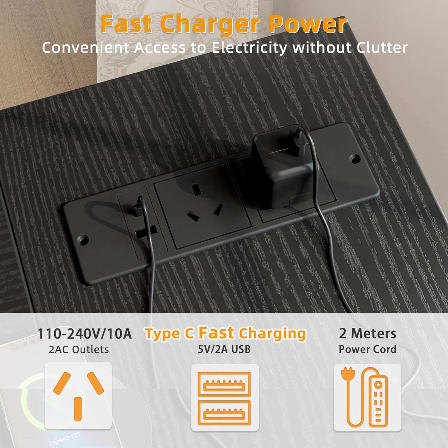 - L Shape Desk with Power Outlets - The l desk has built-in power outlets featuring two AC outlets, one USB port, and one Type-C port, simplifying charging and cutting down on cable clutter.