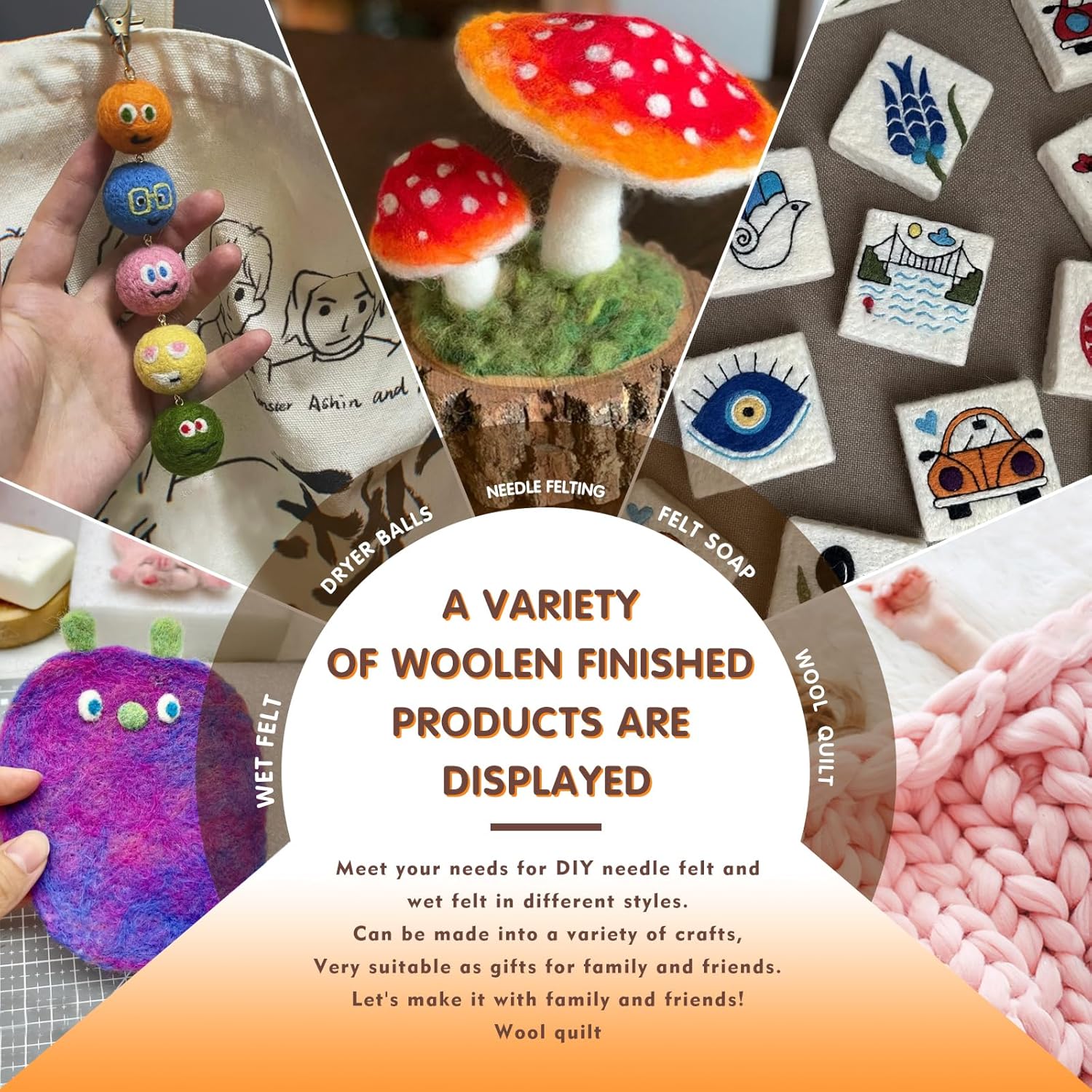 - HIGH QUALITY AND SUPER SOFT: Spins and felts (Wet Felt and Needle Felt) like a dream. Best wool roving to suit various project. This wool felting supplies will help your projects look more beautiful and professional