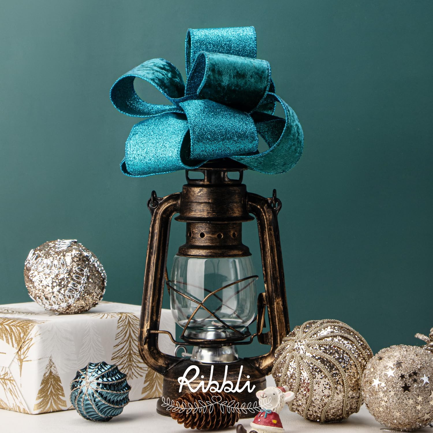 Ribbli Turquoise Blue Velvet Wired Ribbon 2.5 Inch Teal Velvet with Turquoise Blue Glitter Christmas Ribbon for Christmas Tree Decoration Big Bow Gift Wrapping Crafts Wreaths Supplies- 10 Yards