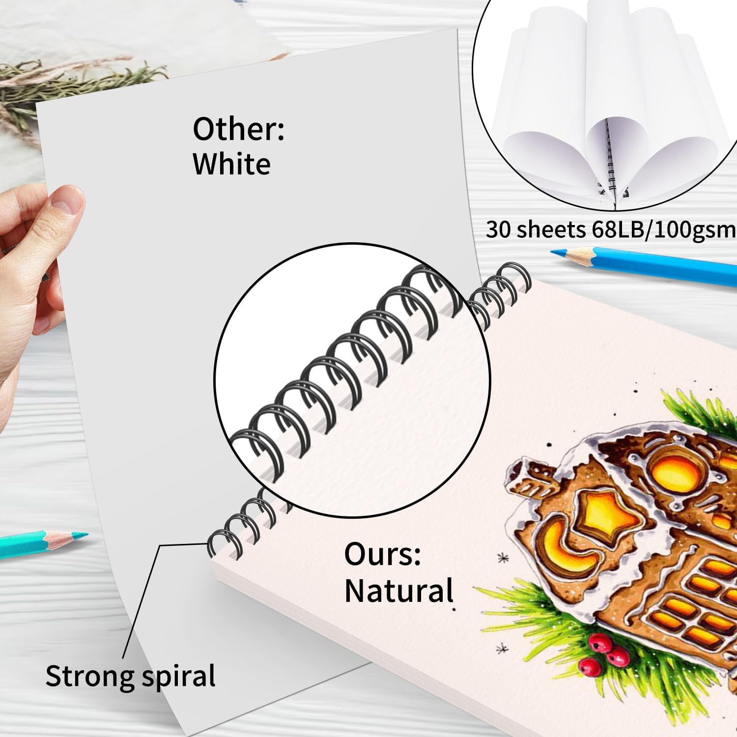 - Premium Paper Quality & Thickened Pad: We adopted 68lb/100gsm natural off white papers with perfect texture and smooth surface. Not worrying about your paintings fading or yellowing over time.The bottom is supported by thick cardboard, which it is perfect for all the sketching needs of the users. Provide a better drawing and writing experience.