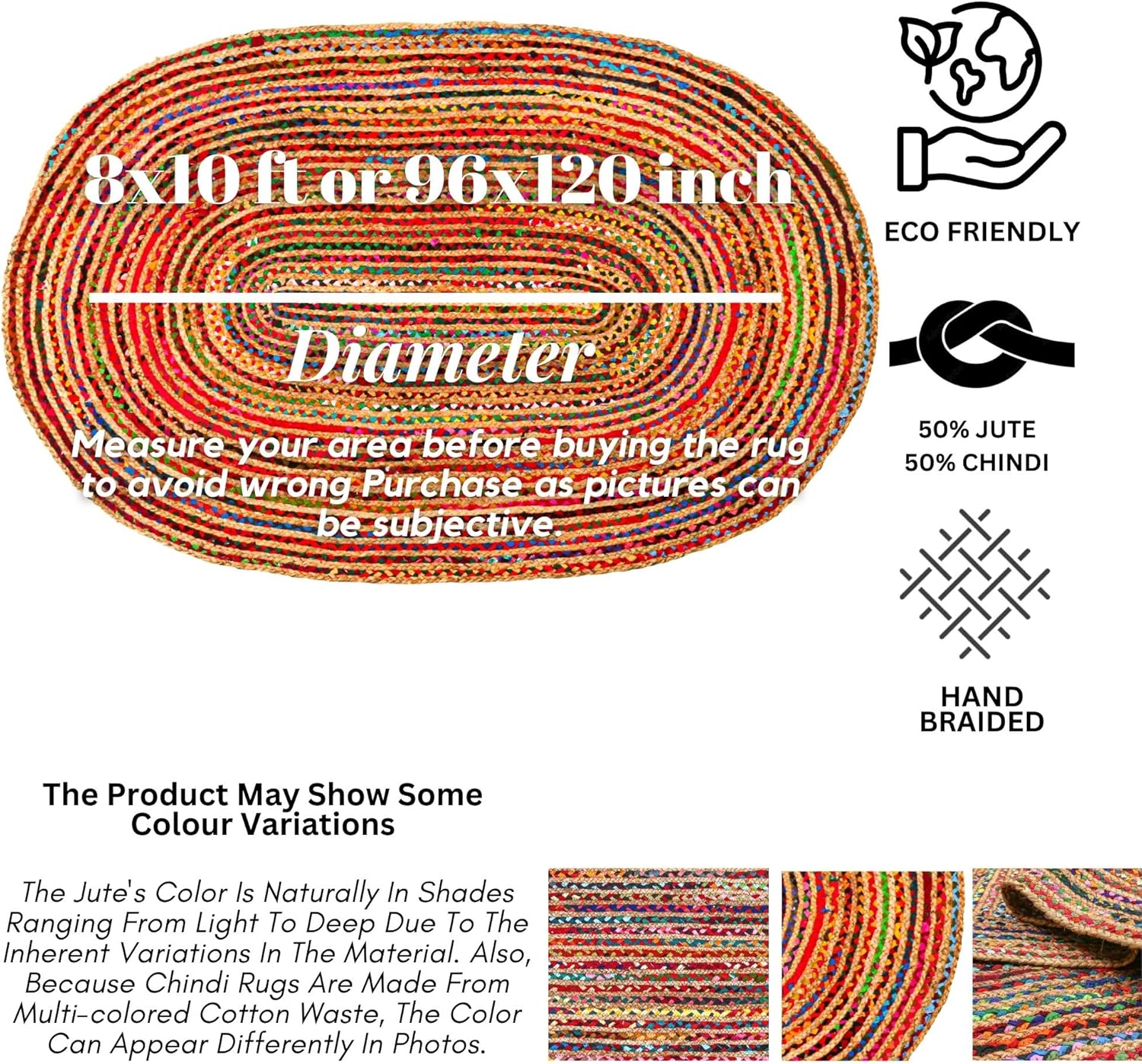 - Natural Materials - Our area rug is skillfully handcrafted in India using a blend of 50% jute and 50% chindi, showcasing exceptional quality and artistry. Due to its handmade nature, slight variations in color and size may occur, adding a unique charm to your home.