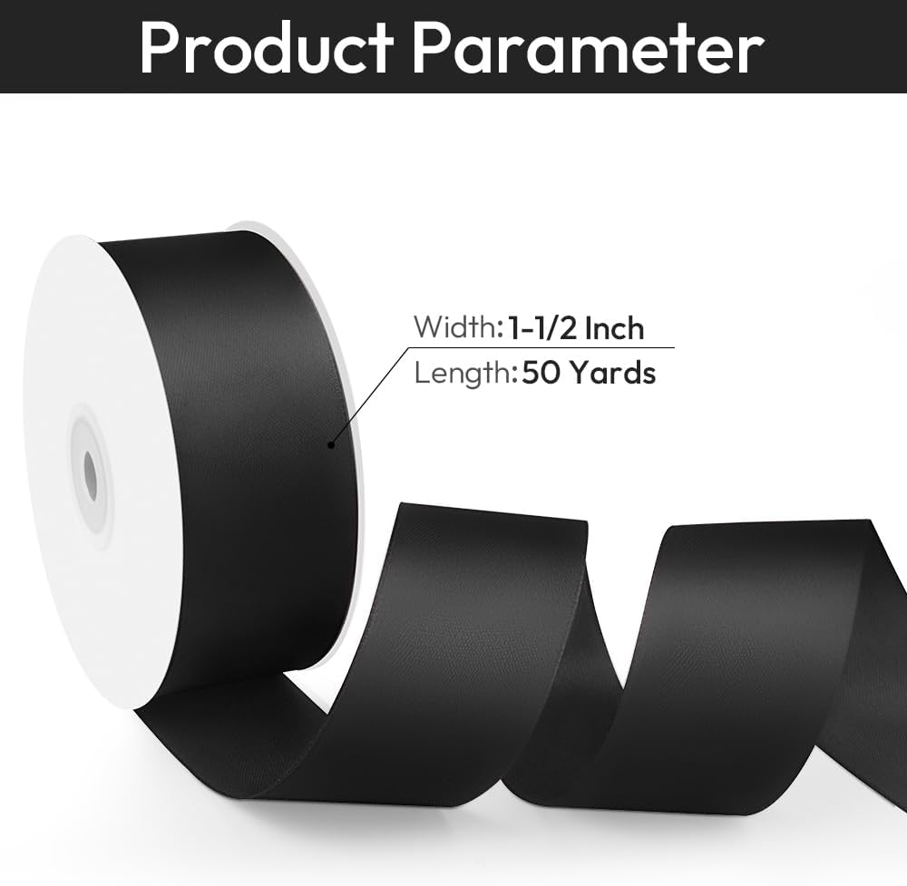 1-1/2" Width x 50 Yards Satin Fabric Ribbon, Black Ribbon Perfect for DIY Bows, Swags, Gift Wrapping, Craft, Flower Bouquet,Christmas and Halloween Party Decoration