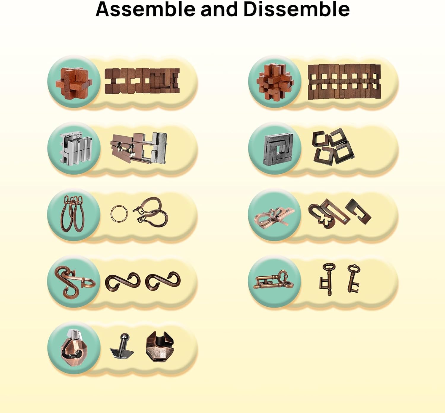 - [BRAIN TEASER PUZZLES ADULTS, TEENS, AND KIDS] Zinc alloy 3D metal puzzles and 3D wooden puzzles are smooth for brain game. Brain teaser wires hand puzzles are a healthier way to passing time, assembly puzzles and disentanglement puzzles, practice focus and concentration, get them as an IQ test challenge game in limited time, bring lots of thinking fun.