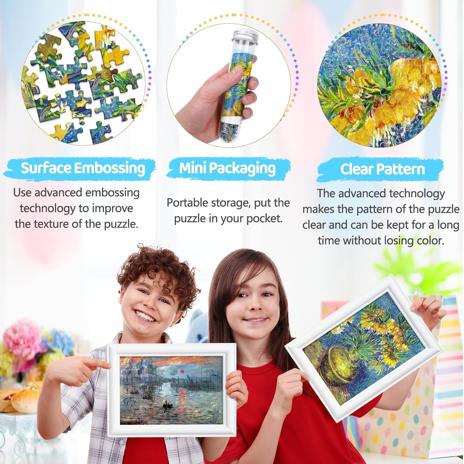 150 Pieces Mini Jigsaw Puzzle for Adults & Kids - 6" x 4" Small Capsule Tube Intelligent Game - Impression Sunrise, Fritillaries in a Copper Vase, Cafe Terrace at Night 3 Pack